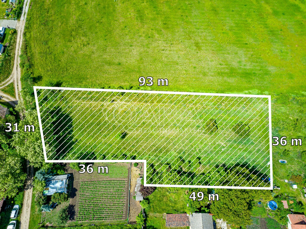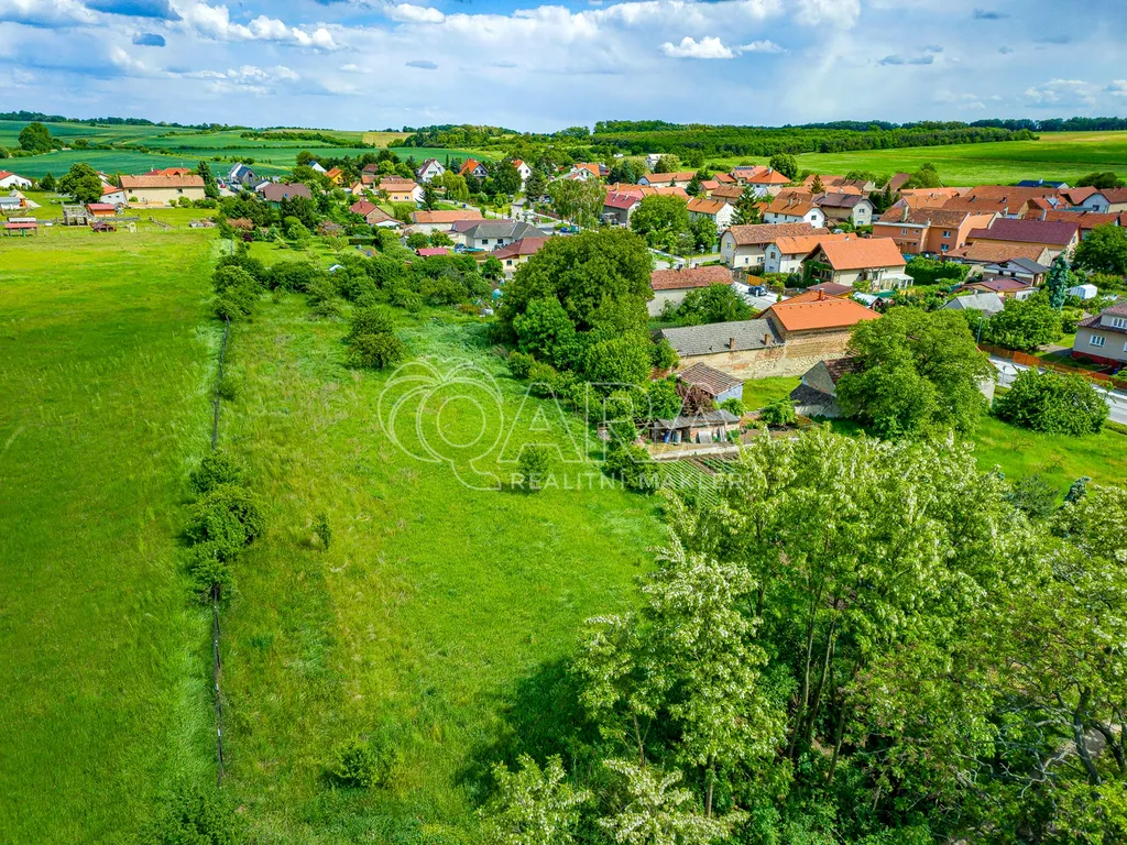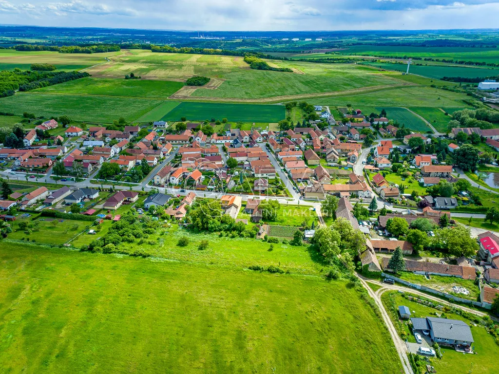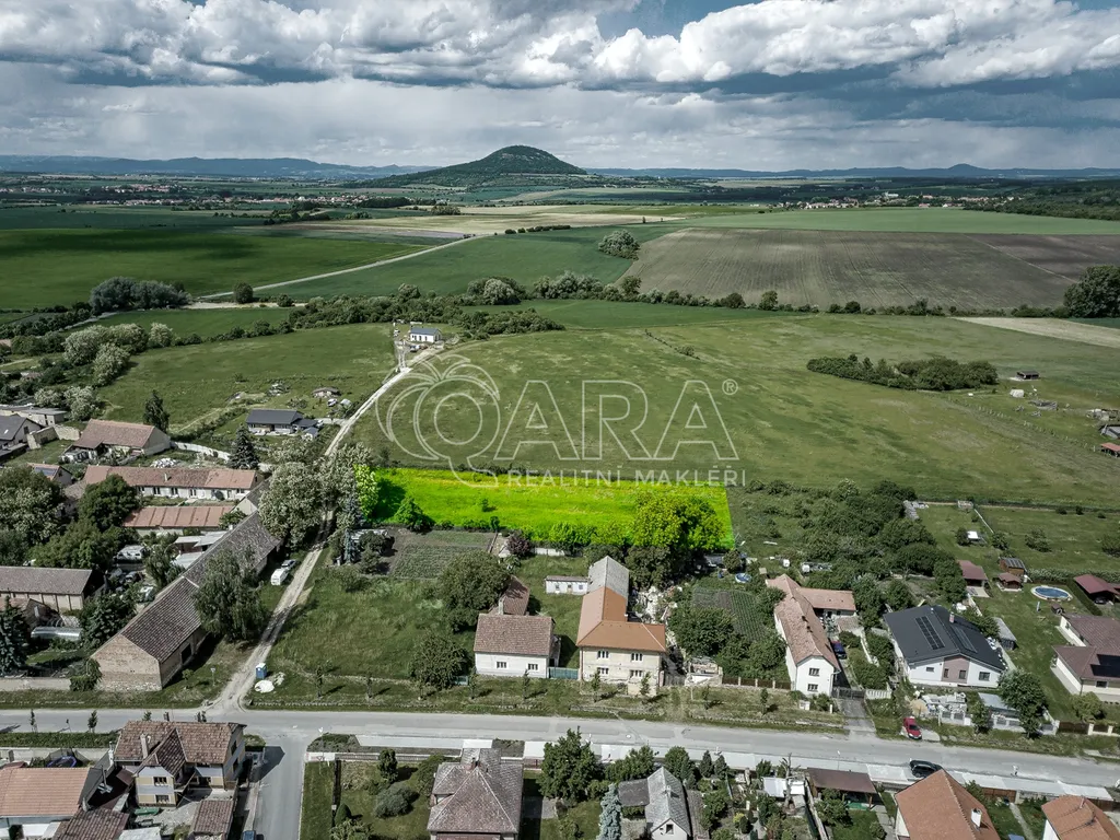 Pozemek má ideální obdélníkový tvar a navazuje na původní zástavbu na okraji obce s příjemným soukromím a výhledem do krajiny, které dominuje hora Říp.
