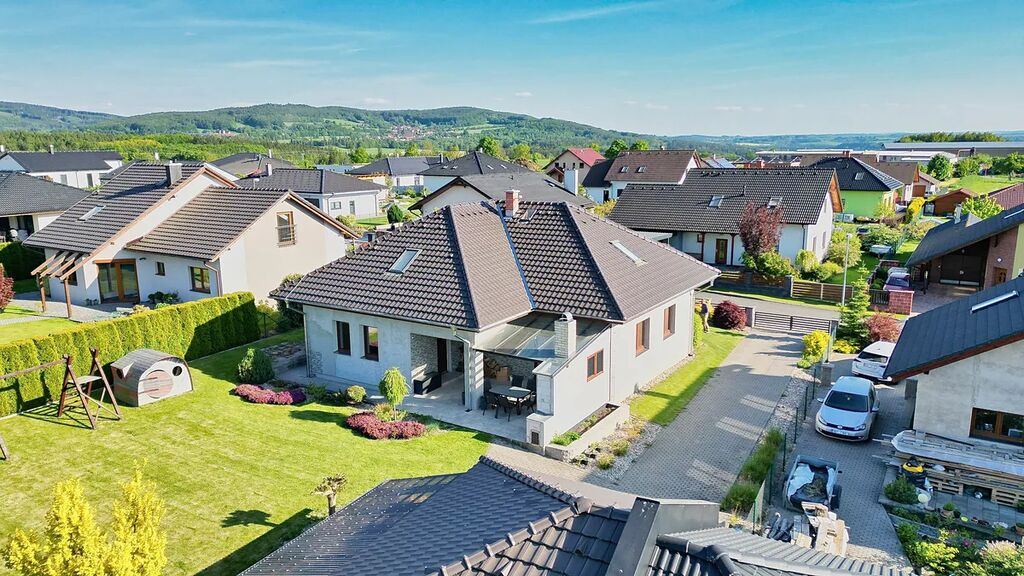 Dům je umístěn na rovinatém pozemku o celkové výměře 927 m² a nabízí ideální kombinaci klidného bydlení. Byl navržen s důrazem na pohodlí a praktičnost, což ocení především rodiny s dětmi.
