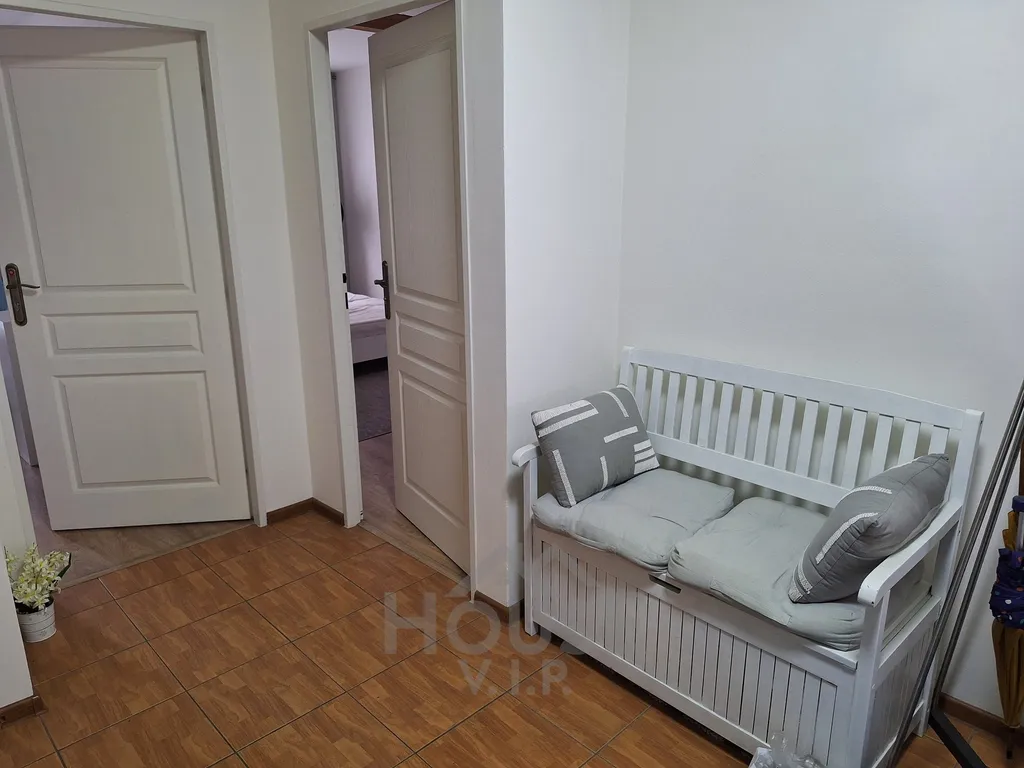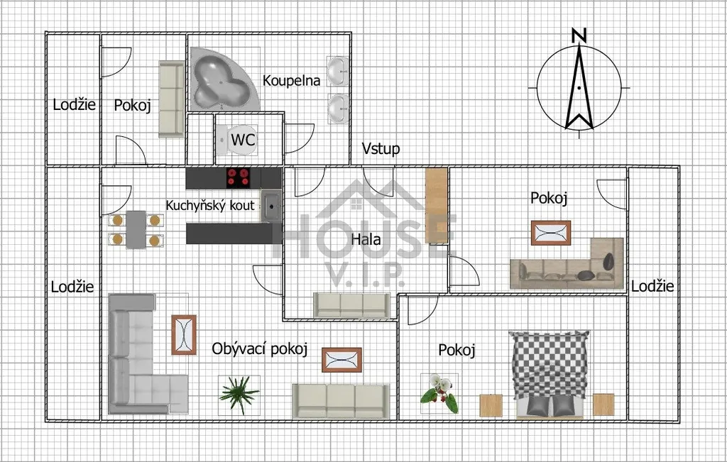 Byt tvoří prostorný obývací pokoj s kuchyňským koutem, tři samostatné ložnice, koupelna s vanou a s dvěma umyvadly, samostatná toaleta, prostorná vstupní hala a tři lodžie s výhledem do klidného okolí. Moderní kuchyňská linka je vybavena spotřebiči (el.trouba, plynová varná deska, lednice s mrazákem, myčka, mikrovlnná trouba) a kuchyňským nádobím. V obývací části a ložnicích je k dispozici nábytek (sedací soupravy, jídelní stůl, postele, vestavěné skříně atd.), který poskytuje dostatek úložného prostoru a prostoru na spaní.