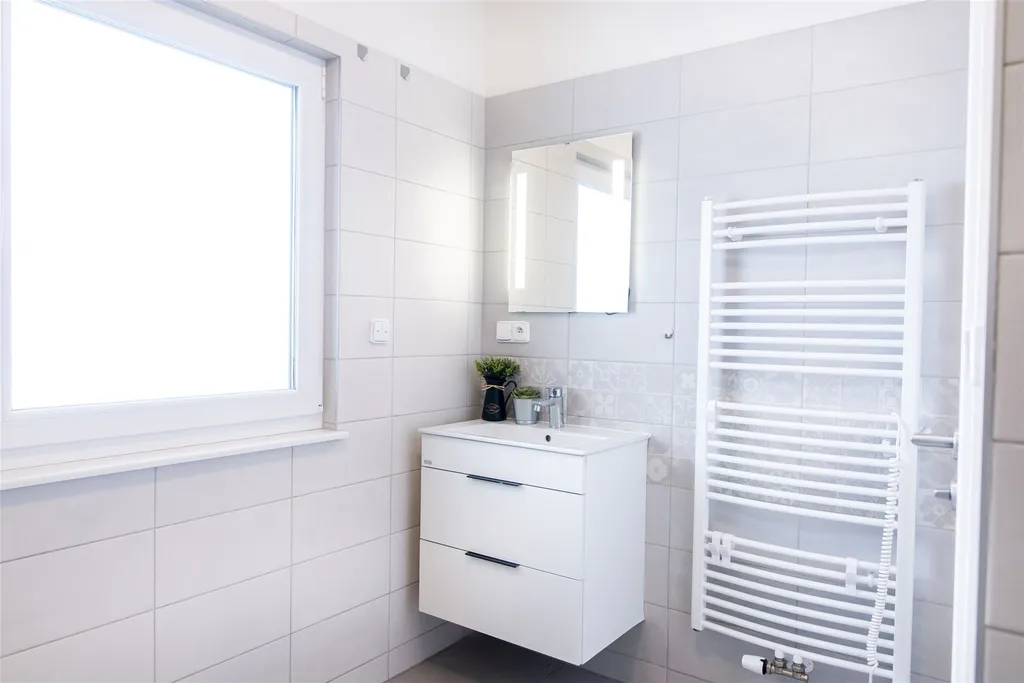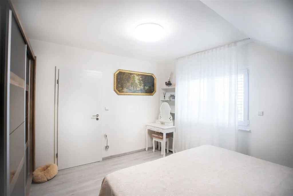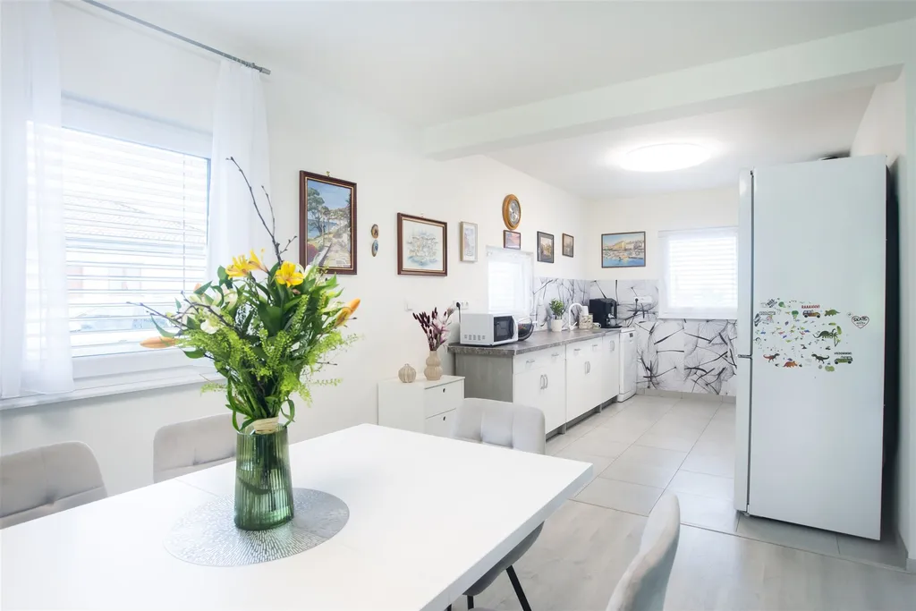 Tento rodinný dům velmi kvalitního provedení je dispozičně řešen jako 4+KK o celkové užitné ploše 111 m2. V přízemí domu se nachází prosvětlená obývací část prakticky propojená s kuchyňským a jídelním koutem se vstupem na zastřešenou terasu a udržovanou zahradu. Dále zde nalezneme technickou místnost a samostatnou toaletu. Dubové schodiště nás zavede do 1. patra domu, kde se nachází samostatné tři pokoje a prostorná koupelna s toaletou. Další praktické úložné prostory nalezneme v půdním prostoru.