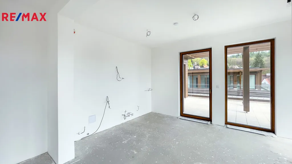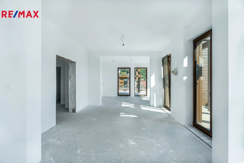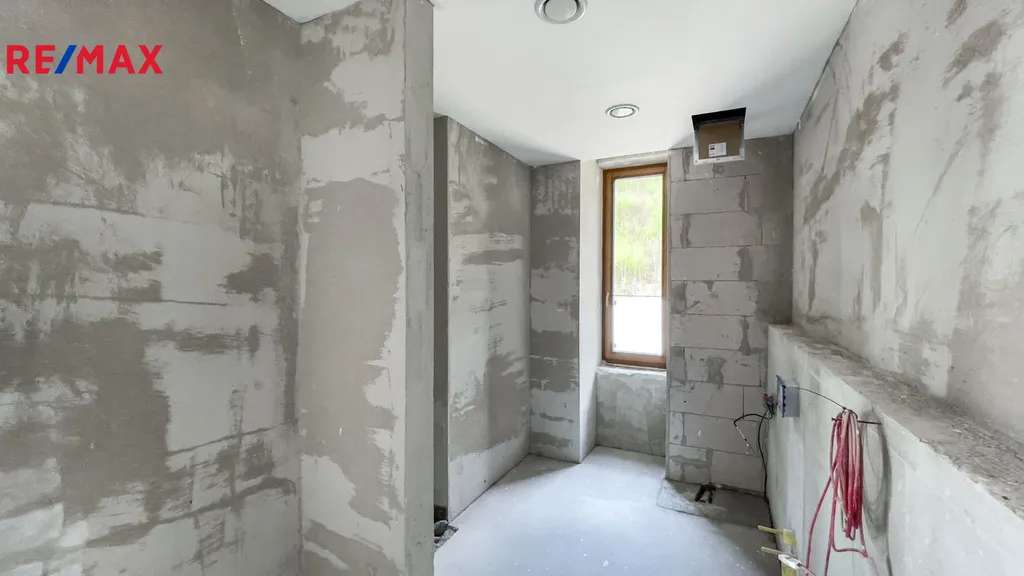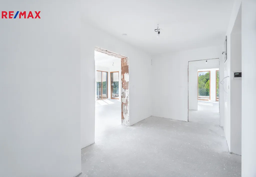 Byt je ve stavu shell & core – tedy s hotovou hrubou stavbou, kompletními rozvody (voda, elektro, topení, kanalizace), připravený na finální dokončení dle individuálního architektonického návrhu.