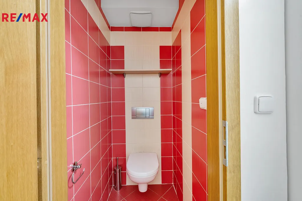 V chodbě se nachází šatní skříně vyrobené na míru a pod schody je praktický úložný prostor. Byt má samostatné WC, koupelnu s vanou a pračkou zn. AEG, která je spolu s varnou deskou stále záruce.