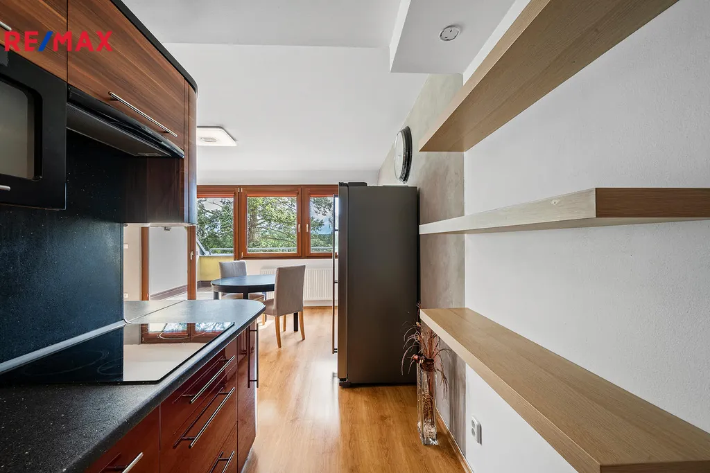 Byt se skládá z velkého světlého obývací pokoje s přímým vstupem na terasu, kde je zavedena elektřina – ideální pro grilování a letní posezení. Součástí obývacího prostoru je moderní kuchyňská linka plně vybavená spotřebiči, včetně americké lednice zn. Samsung, sklokeramické varné desky zn. BOSH, výsuvné digestoře zn. Wirlpool.