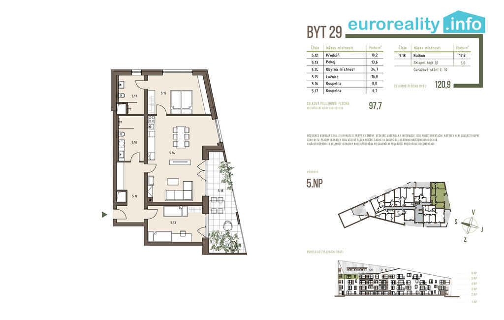Celková užitná plocha bytu 97,7 m² a balkónu 18,2 m² zajišťuje pohodlné a prostorné bydlení. Se sklepní kójí o rozměru 5 m²