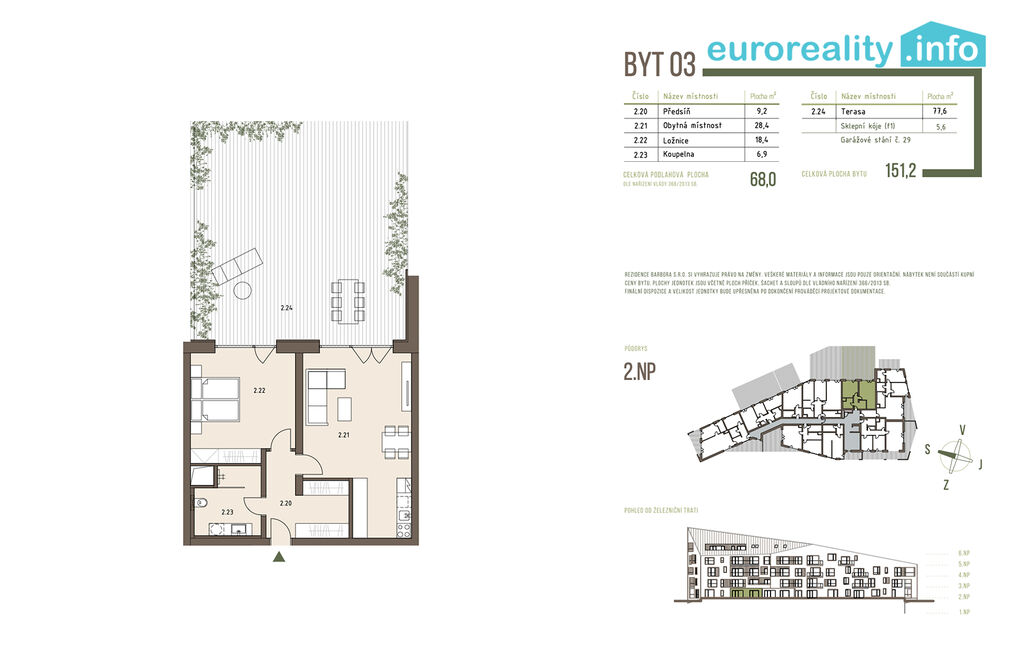 Celková užitná plocha bytu 68 m² a terasy 77,6 m² zajišťuje pohodlné a prostorné bydlení. Se sklepní kójí o rozměru