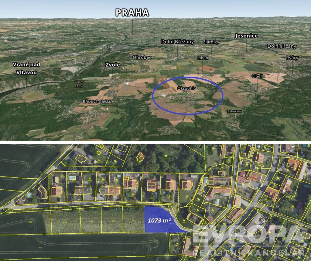 Nabízíme ke koupi pozemek určený k bydlení o celkové rozloze 1073 m². Pozemek se nachází v obci Okrouhlo mezi Dolními Břežany a Jílovým u Prahy a sestává ze dvou na sebe přímo navazujících parcelních čísel o rozloze 900 m2 a 173 m2. Pokud by nebyl zájem o obě parcelní čísla, je možné zakoupit pouze pozemek o rozloze 900 m2 za Kč 5.390.000.