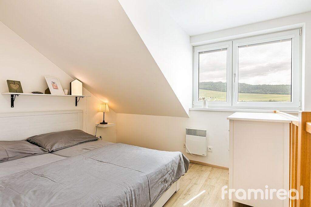 Nemovitost se nachází ve 2. patře horského domu a nabízí komfortní zázemí pro celoroční pobyt. Vstupní chodba disponuje praktickými úložnými prostory, odkud se vstupuje do koupelny se sprchovým koutem a toaletou. Obytná část spojuje kuchyňský kout s jídelním stolem, rozkládací pohovku s TV a komodu. Masivní dřevěné schodiště vede do podkrovní ložnice s manželskou postelí, komodou a druhou koupelnou s toaletou.