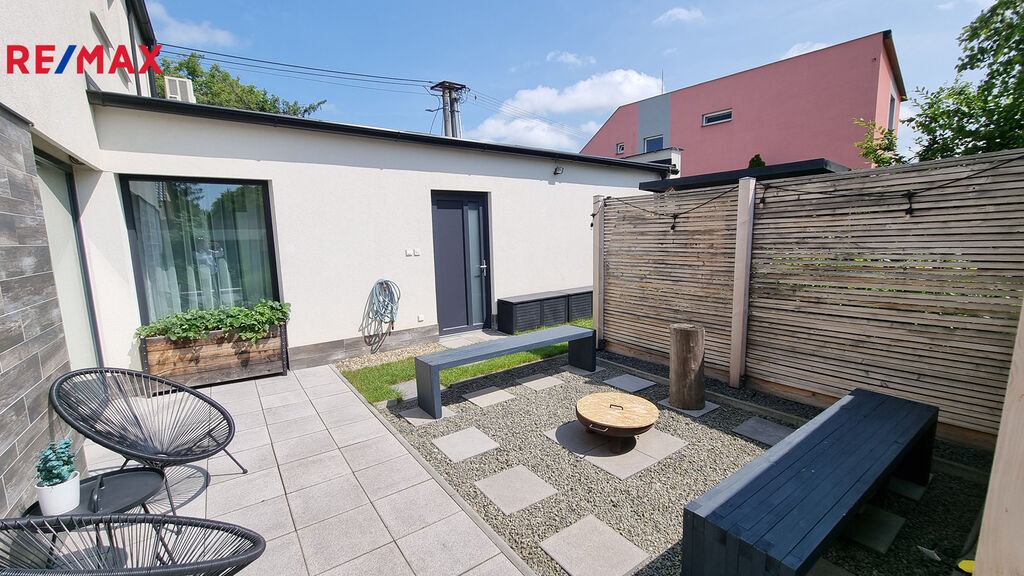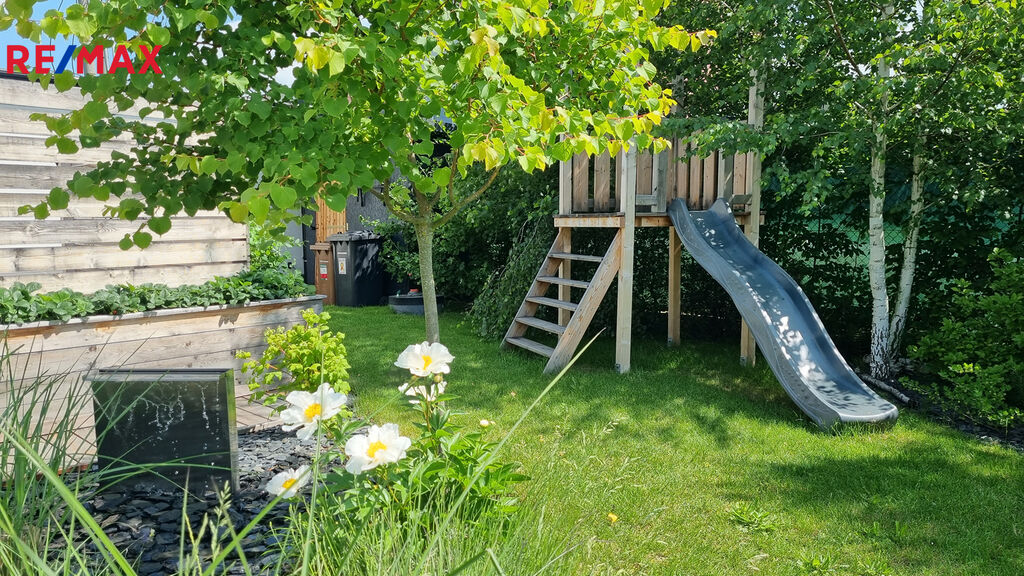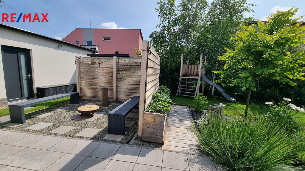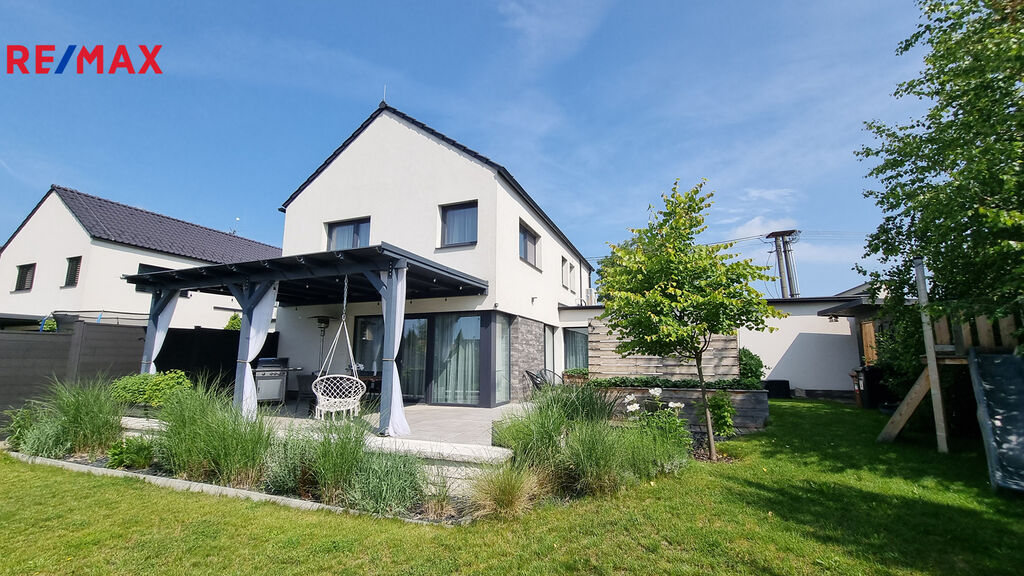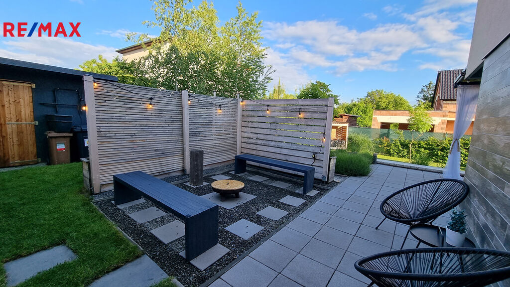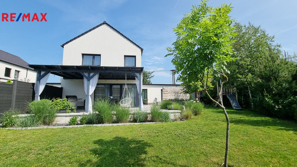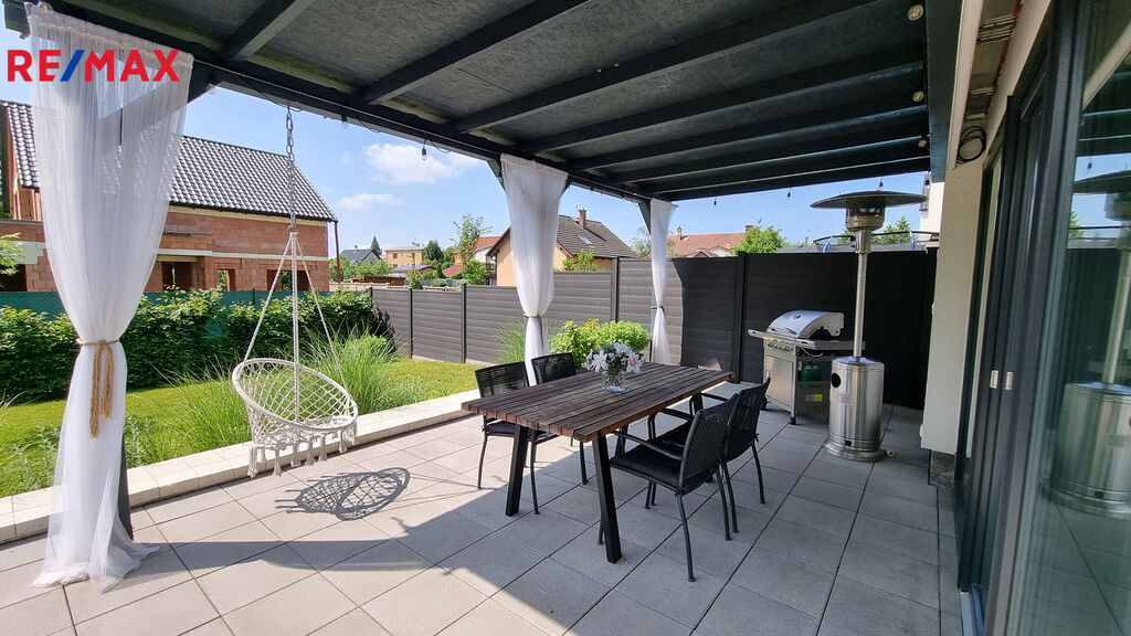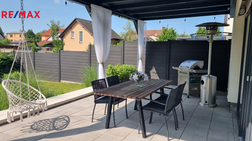 Dům poskytuje v zadní části kryté posezení, ke grilování, setkávání s přáteli a také zátiší na zahradě pro posezení pod širou oblohou, zahradní domek a v zemi retenční nádrž 12 000 litrů + čerpadlo s elektro přípravou.