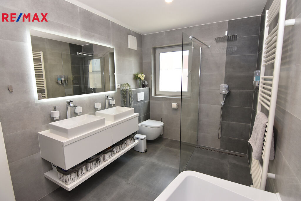 Koupelna má k dispozici jak vanu, tak sprchový kout, toaletu a dvě umyvadla.