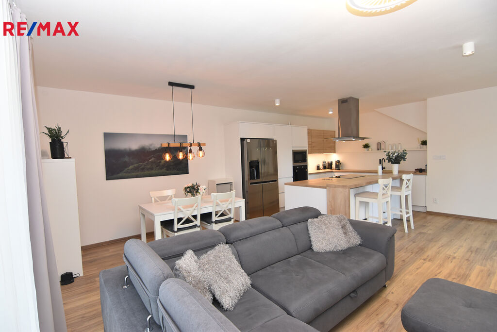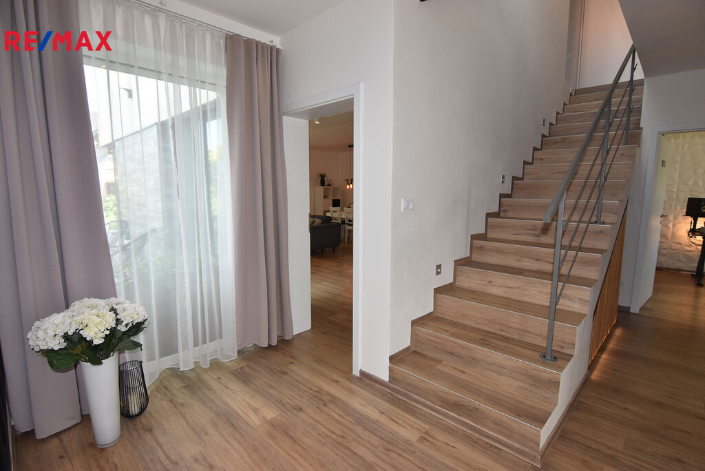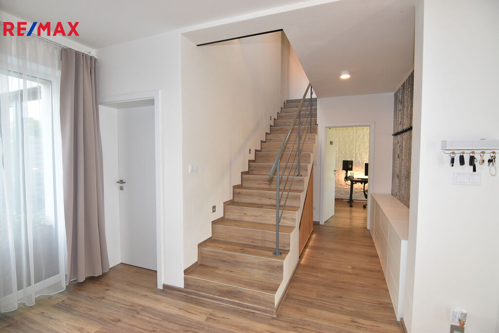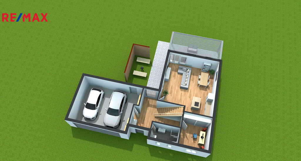 V 1. NP - obývací pokoj s kuchyňským koutem (spotřebiče: lednice - LG, indukční deska - Beko, digestoř - Candy, trouba - Beko, mikrovlná trouba - Beko, myčka - Whirpool), jídelním koutem a dvěma vstupy na zahradu, pracovnu s odhlučněnou stěnou, úložným prostorem pod schody a u stěny, koupelnu se sprchovým koutem (sušičkou - Beko, pračkou - LG) a toaletou. Přímo z chodby se dostaneme do dvojgaráže.