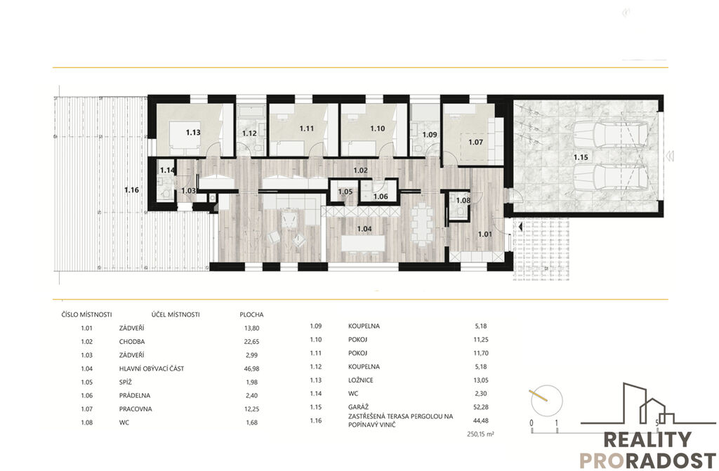 2x zádveří, chodba, obývací prostor s jídelnou a kuchyňským koutem, spíž, prádelna, pracovna, 2x toaleta, 2x koupelna, 2x pokoj, ložnice, zastřešená terasa s pergolou.