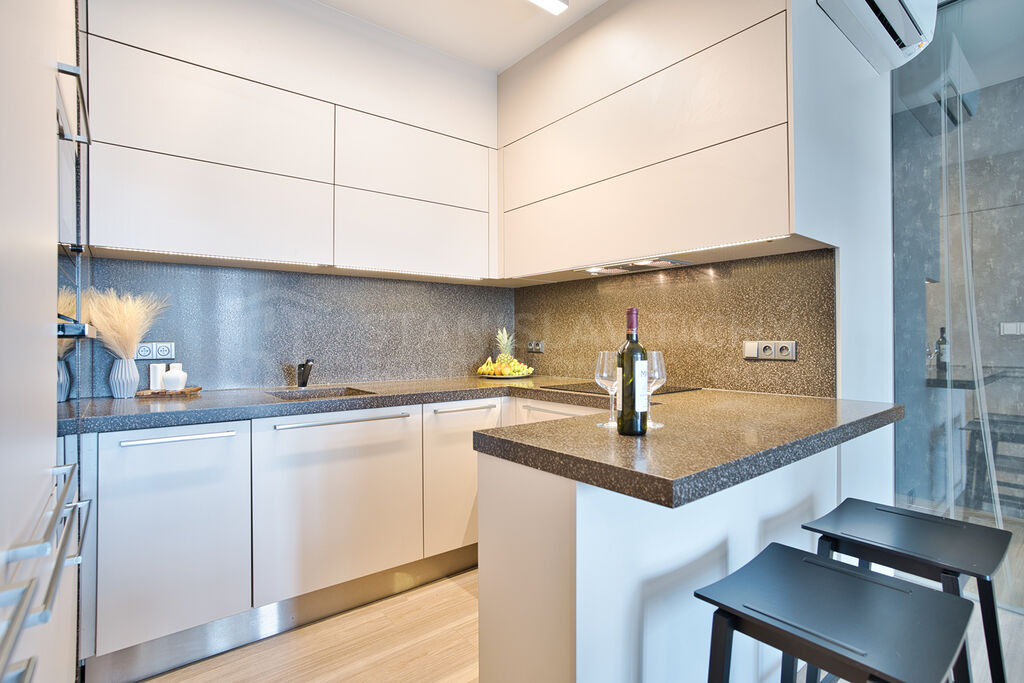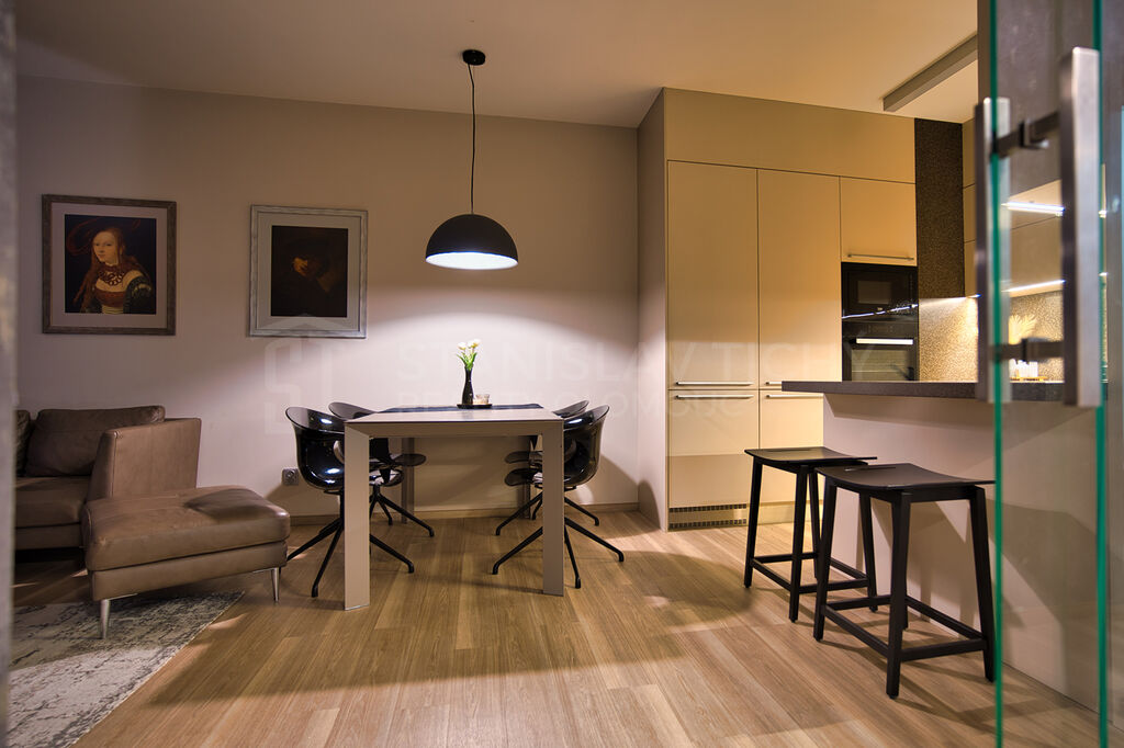 Byt je ve výborném stavu a interiér je kompletně zařízen pečlivě vybraným exkluzivním nábytkem, který dokonale využívá dostupný prostor a zvyšuje estetickou hodnotu interiéru. Otevřený prostor obývacího pokoje kombinuje funkčnost s moderním designem. Moderní kuchyň, vyrobená na míru, poskytuje dostatek úložného prostoru pro vše potřebné a je kompletně zařízena nejen vestavnými spotřebiči, ale také veškerým potřebným vybavením pro pohodlné vaření i stolování.