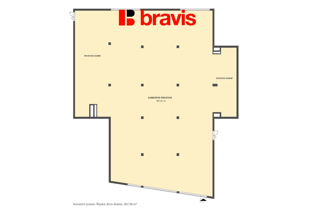 Prostor o velikosti 667 m2 je největším obchodním prostorem v budově, nabízí se tak například k využití jako: