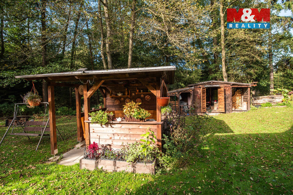 Chatu obklopuje udržovaná zahrada o velikosti 704 m2, na které je umístěna pergola a zahradní domek s dílnou, dále bazén s ohřevem, který je také součástí prodeje. Přístup je po lesní cestě a dále skrz zahrady zajištěn nájmem za 120 Kč/měs.