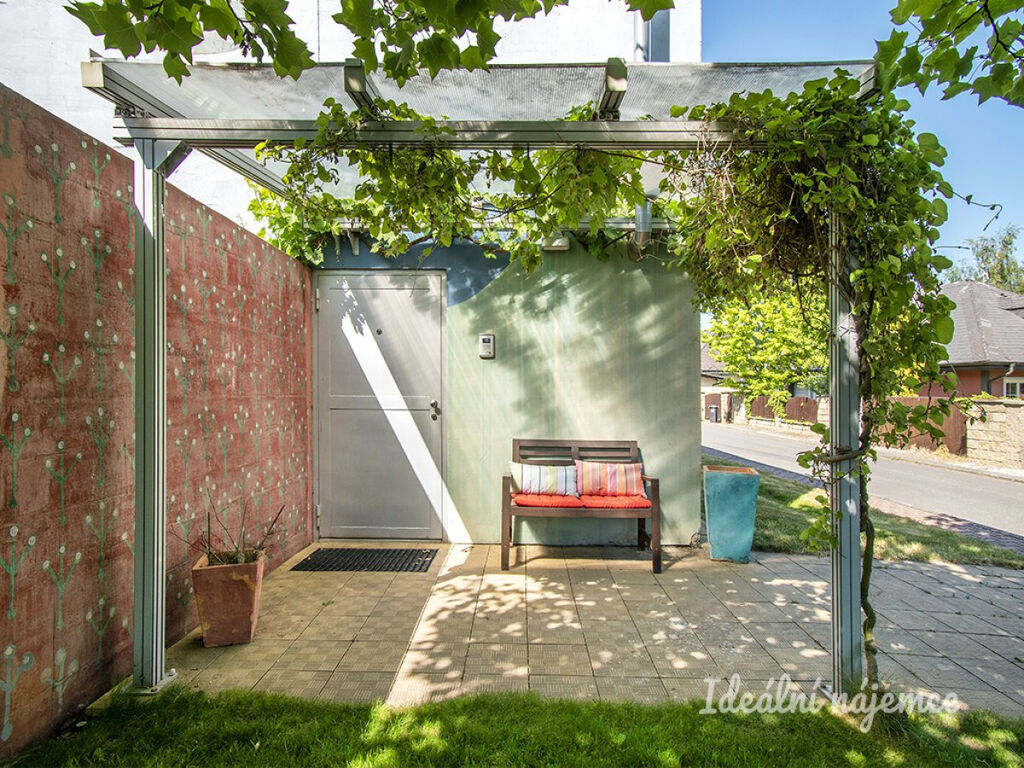 Zahrada nabízí dlážděnou terasu s elektricky ovládanou pergolou s příjemným posezením, automatický zavlažovací systém.