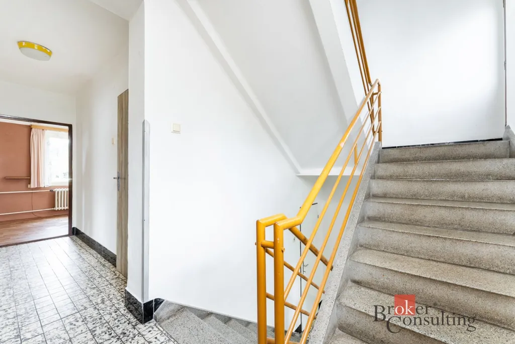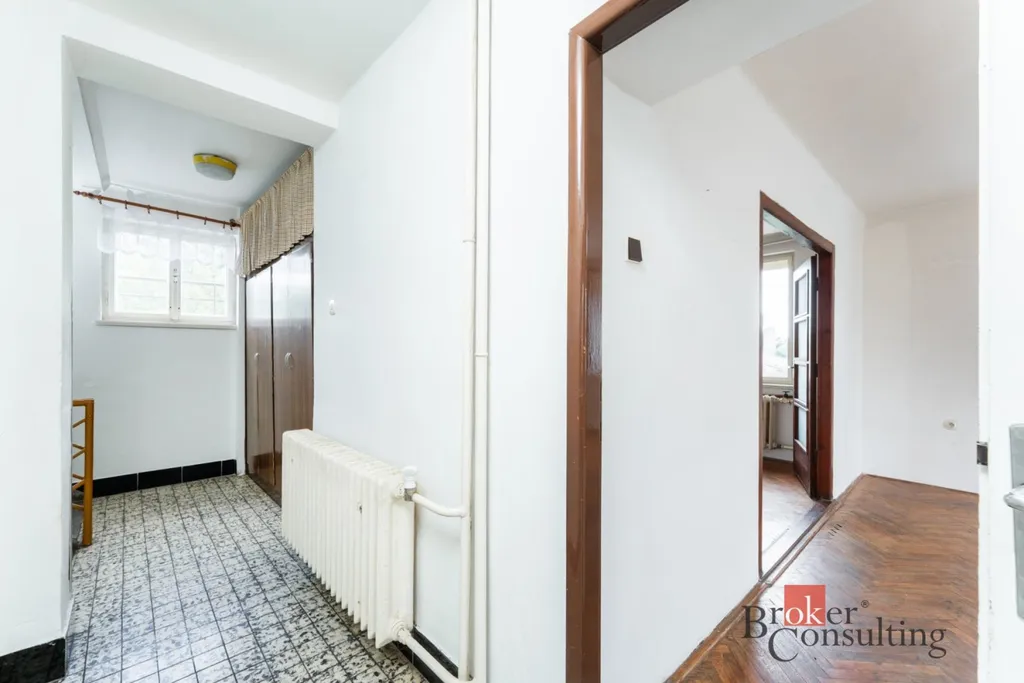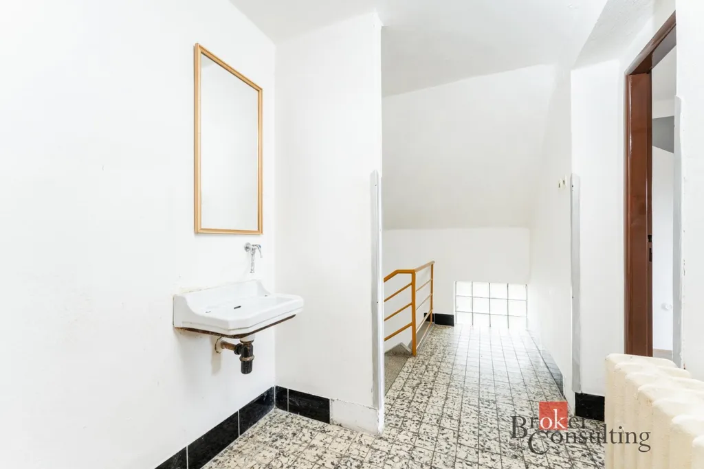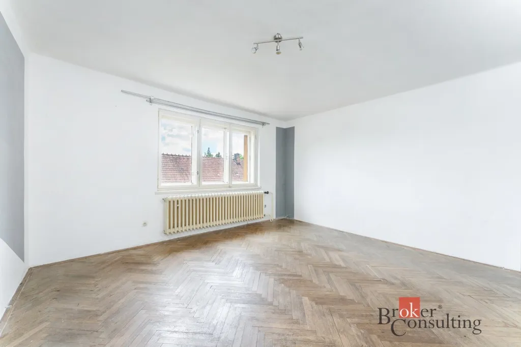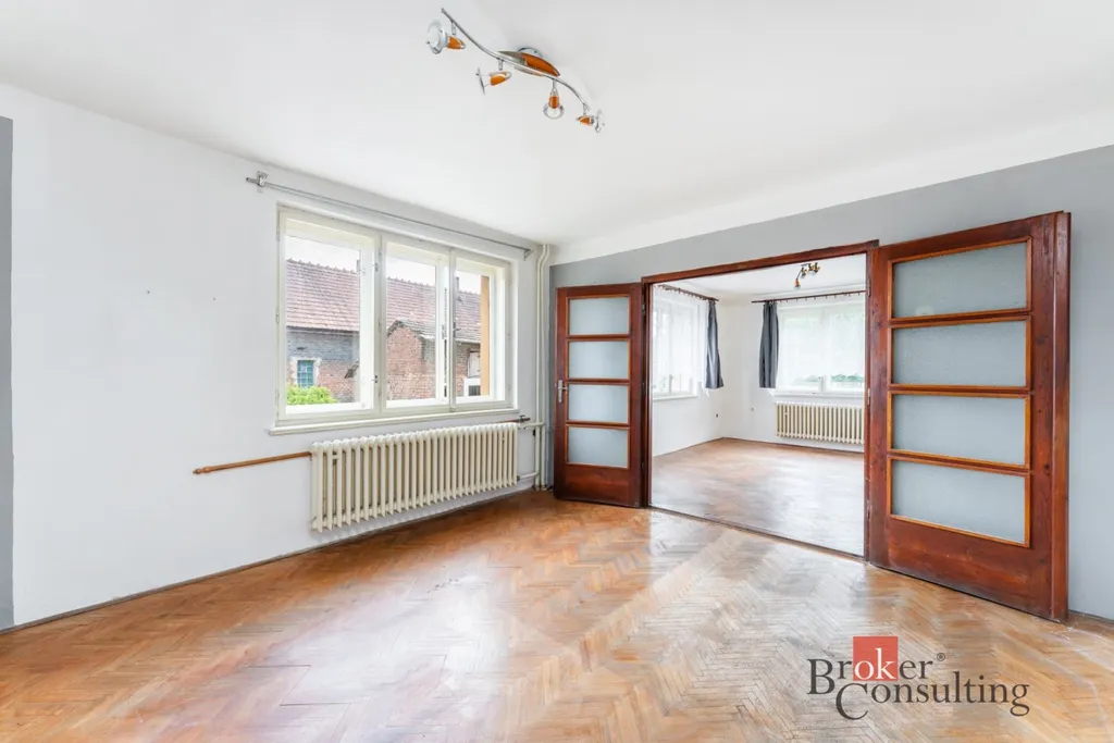 Dispozičně je dům velmi prakticky řešen. V suterénu se nachází prostorný sklep, který nabízí velkou kotelnu, prádelnu a dvě další místnosti vhodné například jako dílna, sklad nebo domácí fitness. Ve zvýšeném přízemí najdete modernizovanou koupelnu, prostornou kuchyň s jídelním koutem, jeden samostatný pokoj a další pokoj, který je průchozí přes velké dřevěné dveře do další místnosti. Tento otevřený prostor působí velmi světle a příjemně a je ideální jako obývací pokoj navazující na kuchyň.