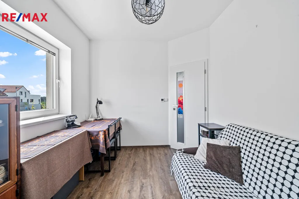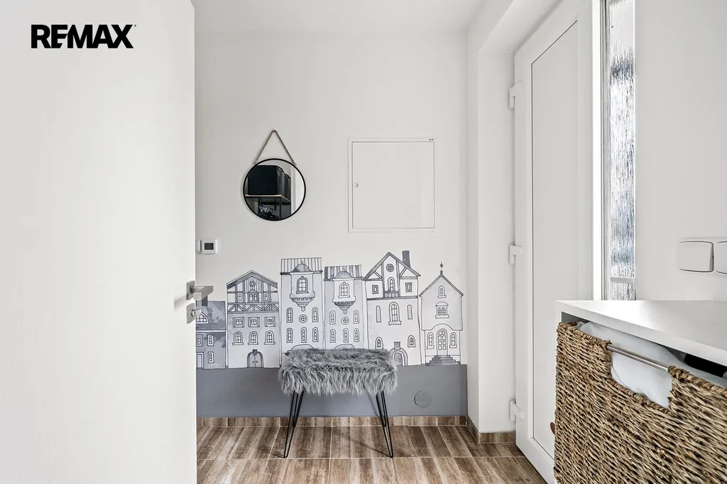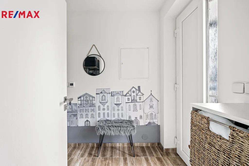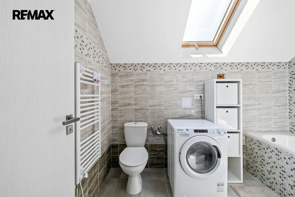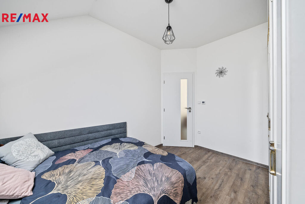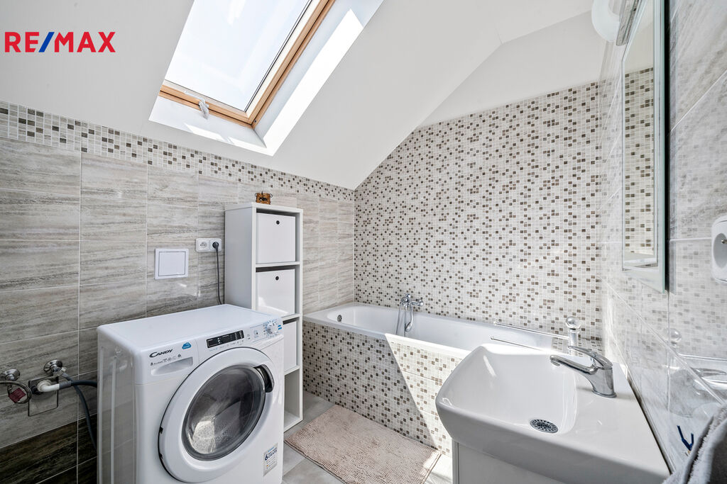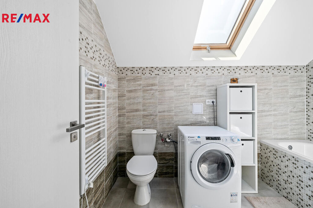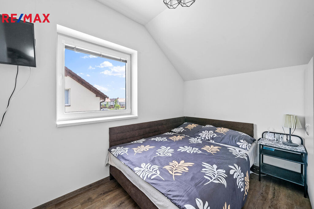 Druhé podlaží disponuje 3 samostatnými pokoji, chodbou, prostornou koupelnou vybavenou vanou, toaletou a pračkou. Po výsuvných schodech se dostanete do půdních prostor.
