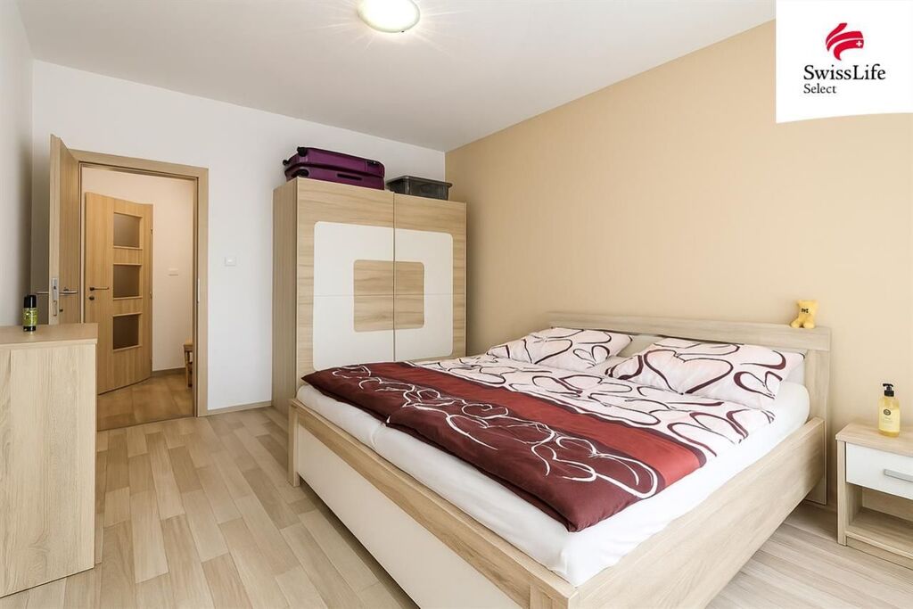 Dispozice bytu zahrnuje velkou ložnici, světlý obývací pokoj, kuchyni s moderní linkou a vestavnými spotřebiči, prostornou koupelnu s rohovou vanou, samostatné WC a praktickou šatnu s dostatkem úložného prostoru. Kuchyně je propojena s obývacím pokojem, který navazuje na předsíň díky tomu působí celý byt vzdušně a funkčně. K dispozici nájemci zůstane lednice, gauč, obývací stěna a skříň.