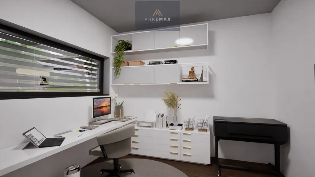 s exteriérem domu. V přízemí se dále nachází koupelna s toaletou, technická místnost a pracovna. Na