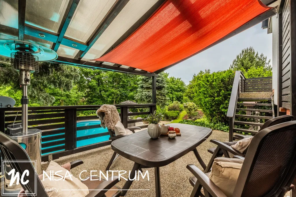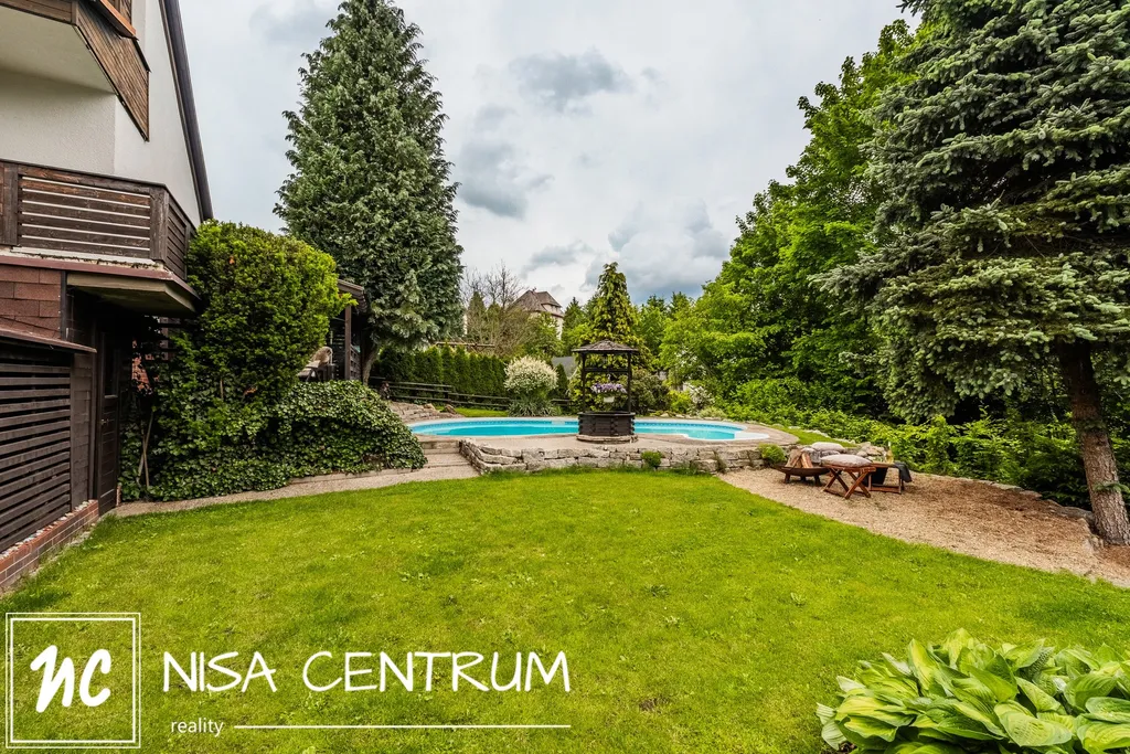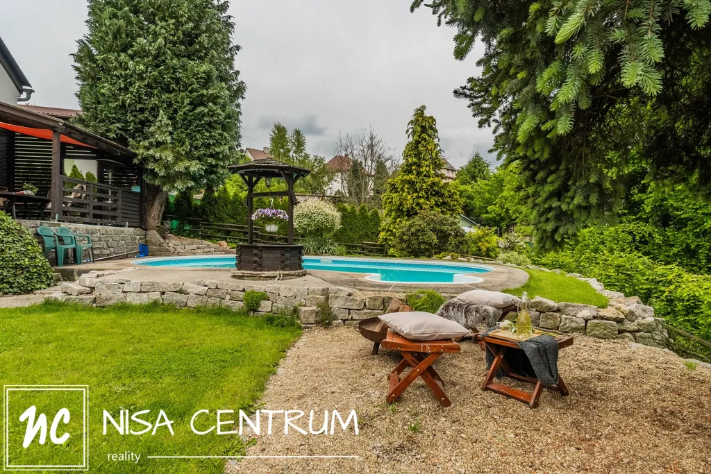 Za domem se nachází naprostá oáza klidu s nádherným atypickým bazénem, dostatečně velkou pergolou pro posezení v letních měsících, dětské hřiště a menší sklípek. Zahradu navrhoval profesionální zahradník.