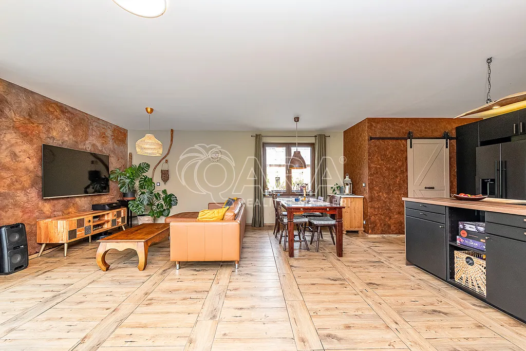 Vytápění a ohřev teplé vody je řešen tepelným čerpadlem vzduch - voda s celkovým ročním nákladem za energie 43 tis. Kč, tj. 3.600,- Kč měsíčně (doloženo vyúčtováním). Topení je v celém domě podlahové. Topit lze i v sálavém krbu a vytopit celý dům. Zdivo porotherm 44 cm, zateplené navíc oproti projektu 4 cm polystyrénem (PENEB bez tohoto dodatečného zateplení), trojtá plastová okna se zesíleným rámem. Kuchyňská linka je plně vybavena, elektrická varná deska, el. trouba, myčka a volně stojící americká lednice. Vlastní vrtaná studna, veřejný vodovod ve výstavbě. Domácí čistička odpadních vod napojena na dešťovou kanalizaci, jímka na dešťovou vodu, dvě plechové garáže (25+ 12m2). Parkování vedle domu pro čtyři auta, oplocení, velký skleník, zabezpečovací zařízení.