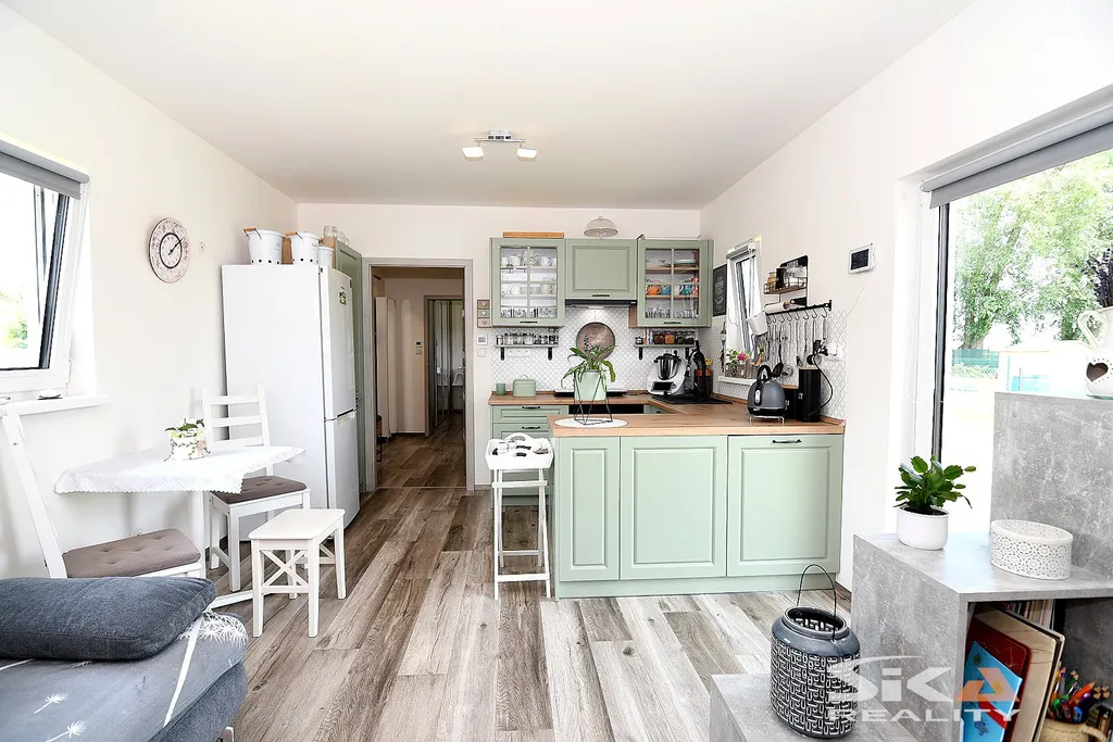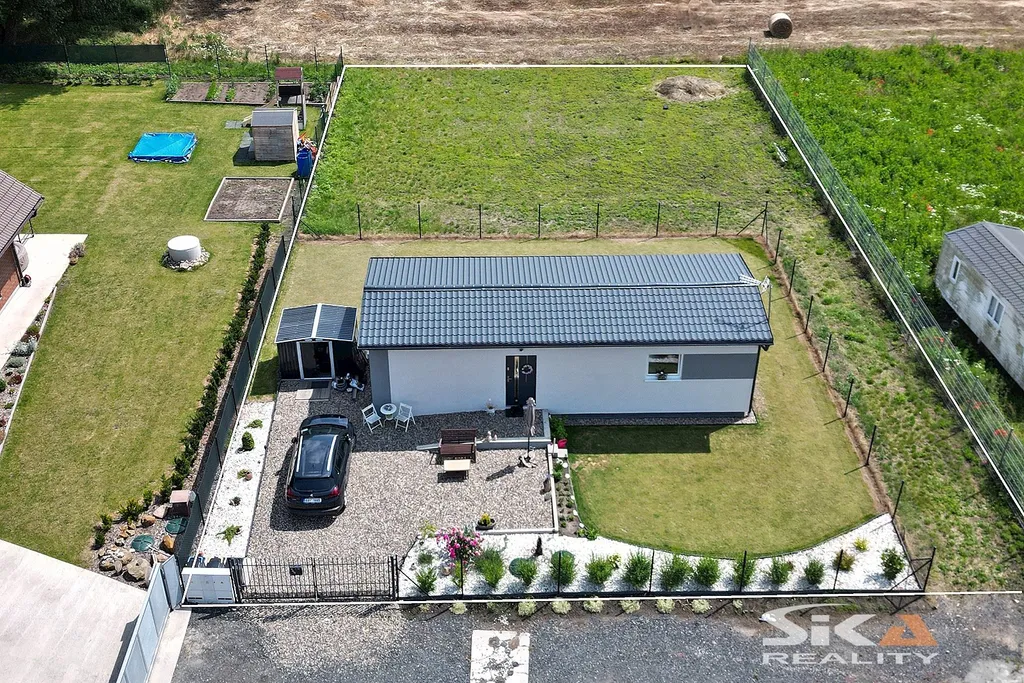 Nabízíme exkluzivně k prodeji novostavbu domu, která je postavena na pozemku obdélníkového půdorysu o celkové zapsané výměře 892 m2 nacházející se v okrajové části obce Cítoliby u Loun. Stavba domu je situována u západní hranice pozemku, má zastavěnou plochu 51 m2, dispoziční řešení 2+kk a celkovou podlahovou plochu cca 40m2. Jedná se o montovanou stavbu typového modulového domu „Český dům“, umístěnou na betonových patkách, která má zřízeny přípojky elektrické energie, obecního vodovodu a kanalizace (přetlaková). Dům má sedlovou střechu, plastová okna s izolačními trojskly s vnitřními zatemňovacími roletami, vytápění objektu je zajištěno stropními topnými fóliemi Heatflow s oddělenou regulací pro každou místnost, v koupelně instalován topný žebřík, ohřev teplé užitkové vody elektrickým bojlerem. Na podlahách vinylová krytina, obložkové zárubně, kuchyňská linka do tvaru písmene „U“ s vestavěnými spotřebiči – elektrická trouba, myčka, digestoř, samostatně stojící indukční varná deska. Dům je umístěn v klidné rezidenční okrajové části obce s množstvím zeleně. Městys Cítoliby se nachází přibližně 3 km od centra města Louny. V obci je základní občanská vybavenost jako mateřská a základní škola, obchod, lékař. Výborné dopravní napojení na dálnici D7. Vzhledem ke skutečnosti, že nebyl předložen PENB, uvádíme třídu energetické náročnosti „G“. Další informace rádi poskytneme v RK.