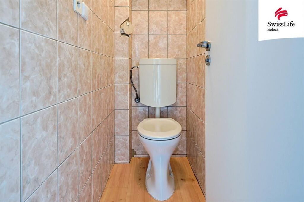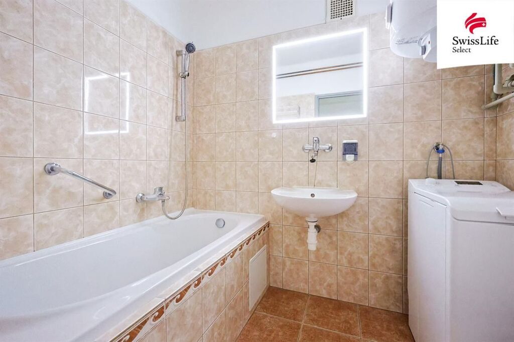 Koupelna je vybavena vanou, WC je samostatné. K bytu náleží také sklepní kóje o velikosti 2,9 m2 a společné prostory v domě. Vytápění je řešeno vlastním elektrokotlem. Voda je městská. Parkování je na ulici před domem.