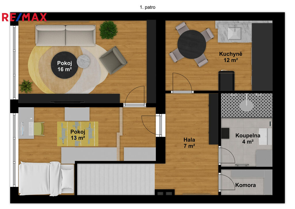 2 NP: pokoj 16 m2, ložnice 13 m2, hala 7 m2, kuchyně 12 m2, koupelna 4 m2.