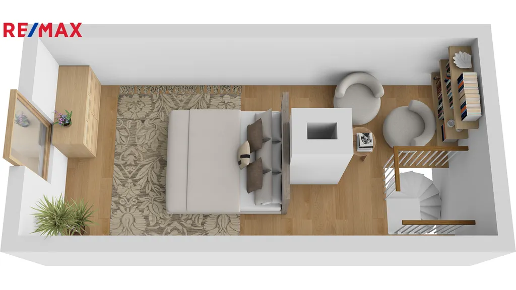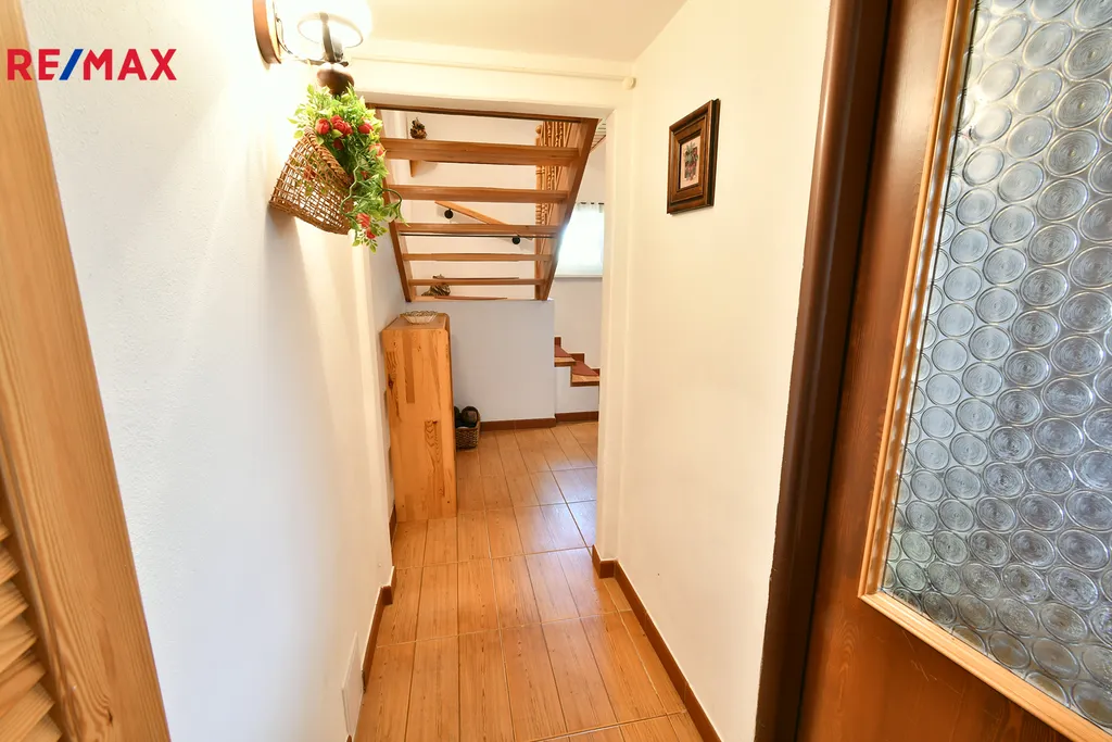 V přízemí se nachází předsíň, jídelna s kuchyňským koutem, obývací pokoj, technická místnost, chodba s úložným prostorem v mezipatře a koupelna s WC. Do 1. patra vede dřevěné schodiště, kde najdete prostornou ložnici s dvěma oddělenými prostorami a vstup na menší terasu. Další schodiště vede do sníženého podkroví, které slouží jako druhá ložnice.