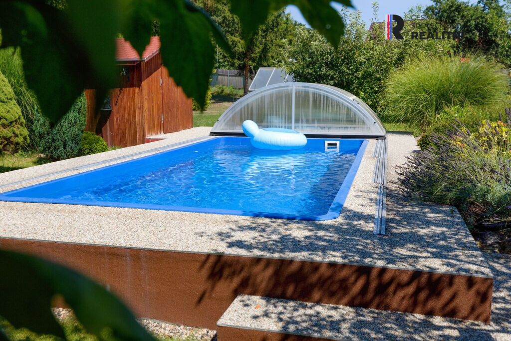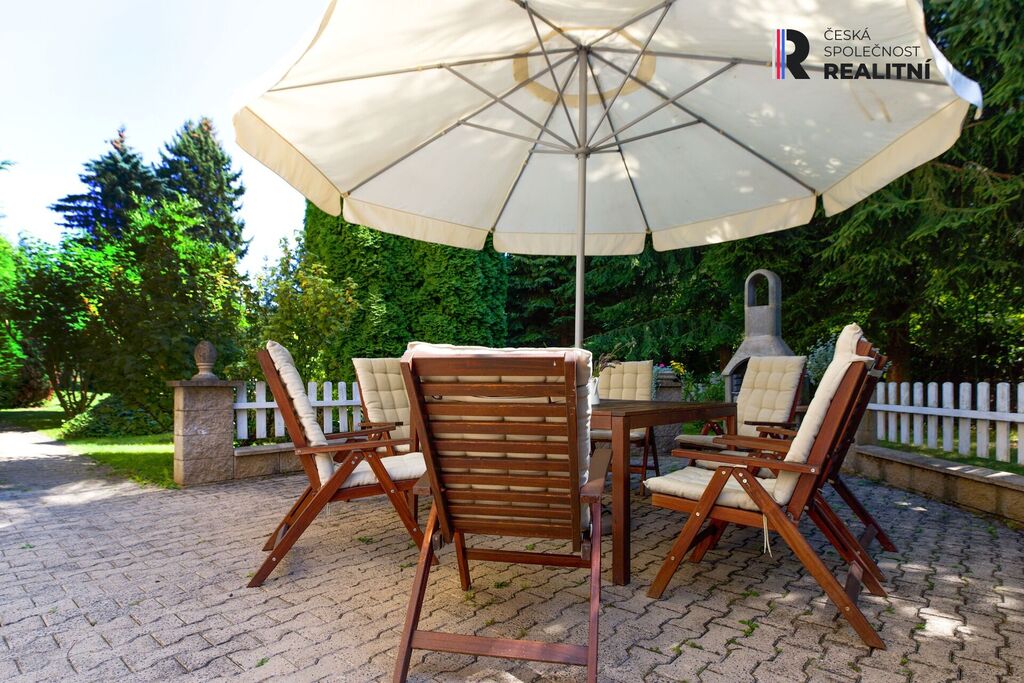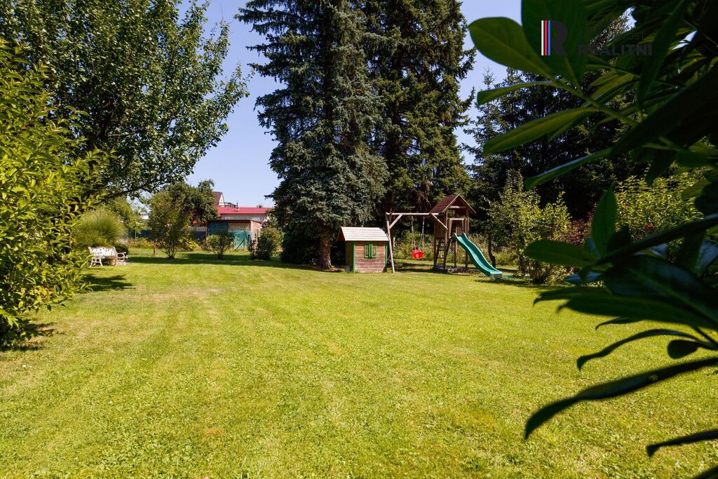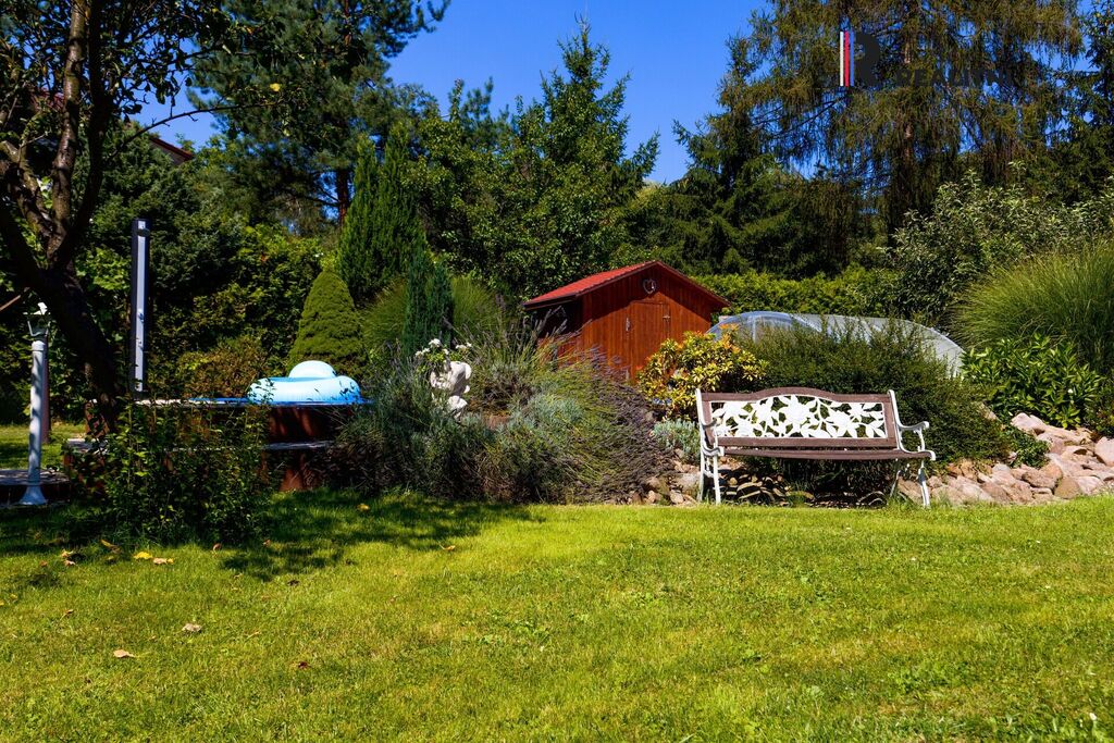 Tato velkorysá zahrada je ideálním místem pro odpočinek, posezení u grilu s rodinou a přáteli nebo pro pěstování vlastní zeleniny a květin. Prostor tu má také dětské hřiště, je zde zastřešený bazén, houpačka, altánek, ohniště, udírna, skleník aj.