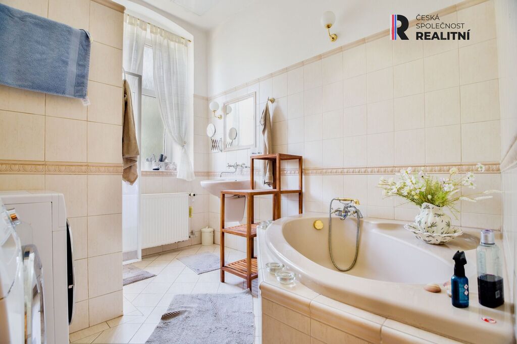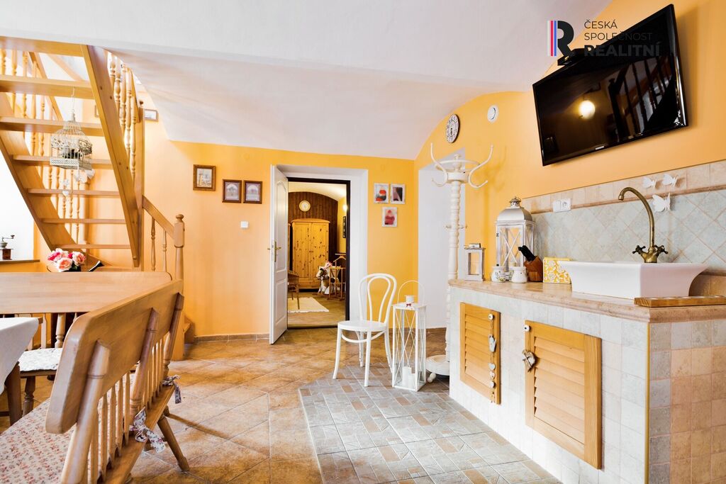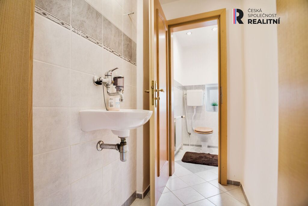 Dále sprcha, sociální zařízení (pisoár a toaleta), společenská místnost 20m2 se vstupem na zahradu či po nově vybudovaném dřevěném schodišti do prostorné bytové jednotky 2+1, s koupelnou s vanou, sprchou a odděleným WC.