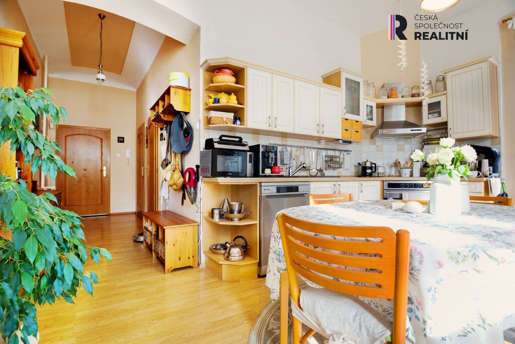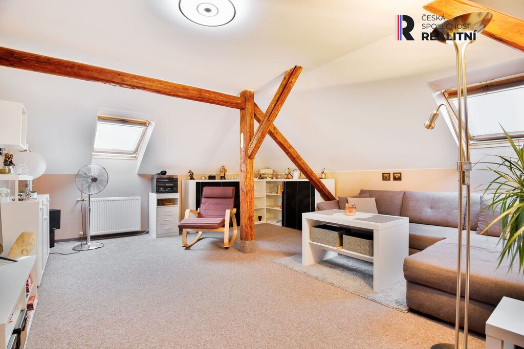 Ve čtvrtém podlaží je půdní prostor, který byl upraven na bytovou jednotku 3+kk o výměře 90m2. Zde je koupelna se sprchovým koutem a WC, střešní okna v každé z místností.