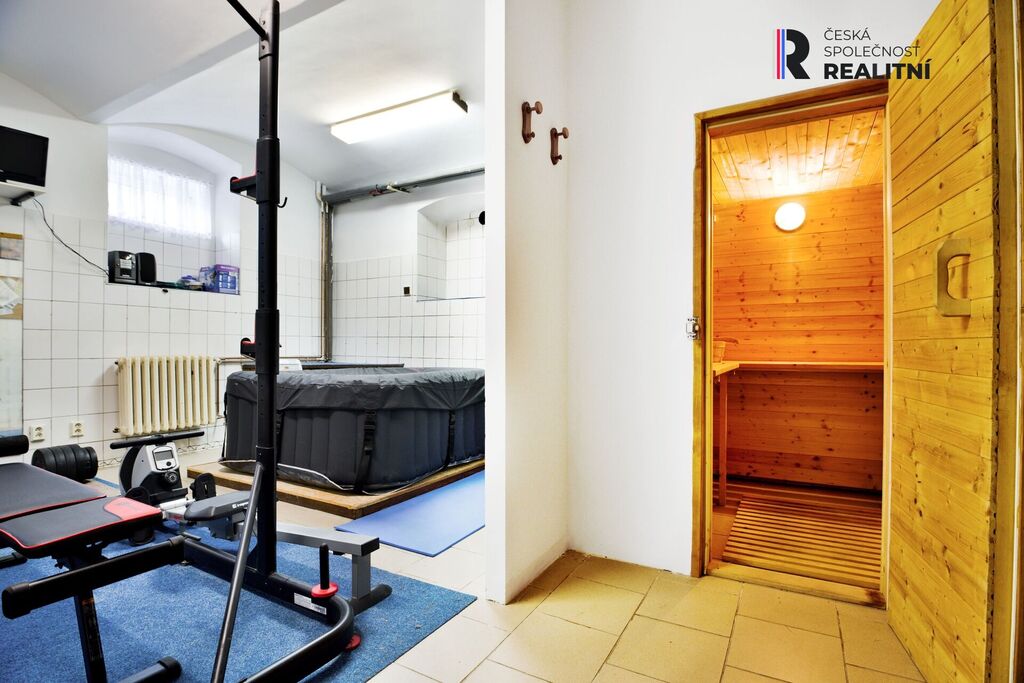 Je zde jedna obytná místnost 22m2, sauna, fitness s whirlpool, technická místnost, sklad, vcod do garáže s dílnou o zastavěné ploše 66m2 a zároveň  se schody do hlavní vstupní chodby.