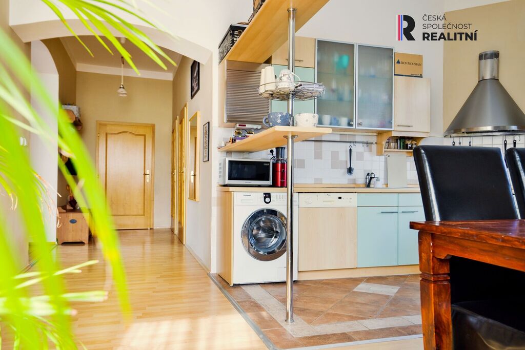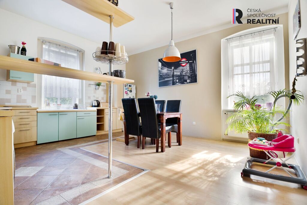Ve druhém patře je jednotka 100m2, o upravené dispozici na 3+1 pro rodinu s dětmi. Disponuje samostatnou velkou kuchyní, koupelnou a třemi pokoji. Opět jsou zde k dispozici krbová kamna a celý byt má velmi příjemnou orientaci.