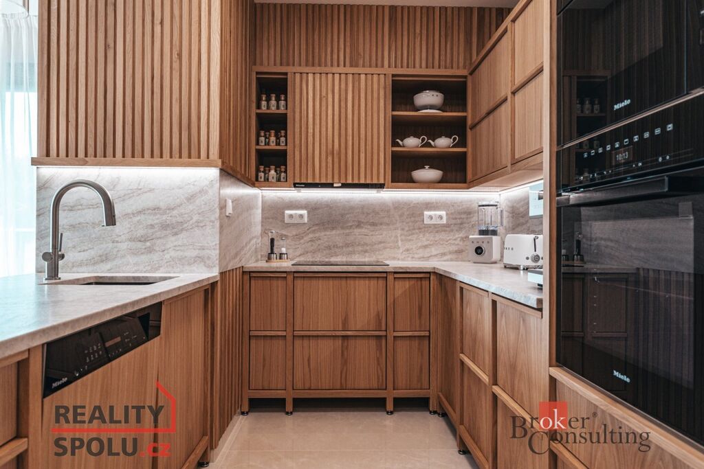 Byt je nabízen kompletně vybavený – stačí přijít s osobními věcmi a můžete začít nový život. Vybavení zahrnuje nábytek na míru z dubového masivu a špičkové spotřebiče značky Miele. O příjemné klima a zároveň záložní vytápění se stará klimatizační systém Siemens. Všechny použité materiály i řešení interiéru byly vybírány s důrazem na estetiku, funkčnost, nadčasovost a především kvalitu. Obklady a dlažby pocházejí od italského výrobce Mirage (série Royal), kuchyňské baterie s dřezem a filtrem na vodu dodala renomovaná značka Hansgrohe, osvětlení je z Itálie – Axolight Muse, pracovní kamenná deska Tachmahad a drobné spotřebiče značky Smeg. Zde opravdu není co vytknout.