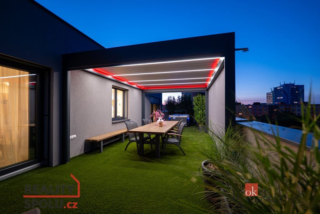 Jednotka o dispozici 3+kk ( 78 m² ) s prostornou šatnou je situována v posledním, pátém patře moderního domu a nabízí absolutní klid, soukromí a výjimečný standard bydlení. Největší dominantou je terasa o rozloze úchvatných 80 m², která obepíná celý byt a byla navržena jako soukromá relaxační zóna. Naleznete zde bioklimatickou pergolu, vířivku a vzrostlé stromy se samozavlažovacím systémem, které zajišťují maximální soukromí a navozují atmosféru luxusního apartmánu v přírodě. Každý vstup na terasu je tak malým únikem z města – do zeleně a ticha přilehlého parku.