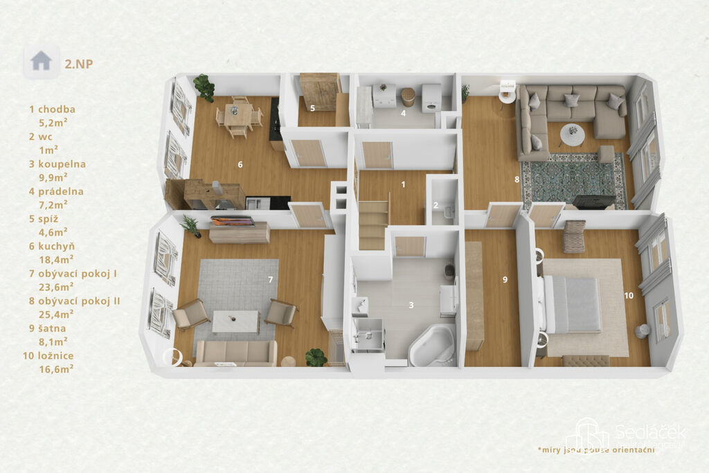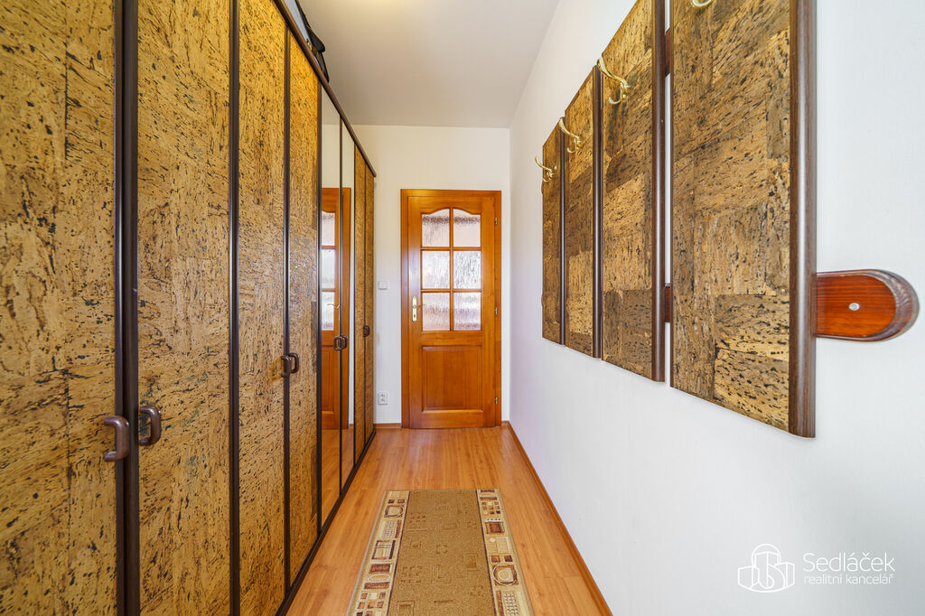 Dispozice bytu zahrnuje velkou předsíň, prostornou kuchyň, obývací pokoj, dvě ložnice, komoru, šatnu a prádelnu. Koupelna je vybavena vanou, sprchovým koutem i bidetem. Vytápění je vyřešeno moderními sálavými konvektory. Ty kombinují výhody sálavého a konvekčního tepla, ohřívají vzduch i pevné povrchy v místnosti a zajišťují tak příjemné a rovnoměrné teplo bez víření prachu. Navíc je v kuchyni, předsíni a koupelně podlahové topení.