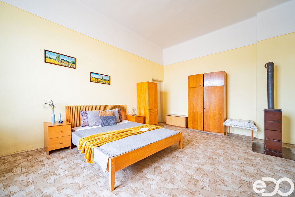 Byt má funkční a promyšlené uspořádání: z chodby vstupujete do koupelny s WC, do prostorné kuchyně s jídelním stolem a spíží, a také do velkého obývacího pokoje. Na ten navazuje ložnice a menší zadní pokoj – ideální jako pracovna, šatna nebo prostor pro domácí podnikání.