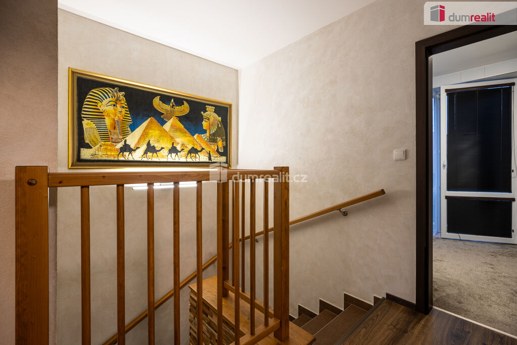 V patře jsou tři pokoje, koupelna a technická místnost s kotlem. Z ložnice a koupelny se dá vstoupit na balkon, který je situován do ulice.