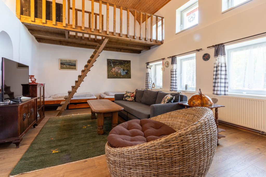 Objekt nabízí pohodlné ubytování pro 4 až 8 osob. V patře se nacházejí dvě průchozí ložnice s celkem pěti lůžky, v přízemí je společenská místnost s dalšími třemi lůžky. K dispozici je vybavená kuchyň, koupelna s vanou a toaletou v přízemí, další WC se nachází v patře. Chalupa je vytápěna plynovým kotlem, což umožňuje celoroční využití. Velkou výhodou je ovládání kotle na dálku, v zimě tak přijedete do vyhřátého domu. Zahrada nabízí příjemné posezení pod pergolou a možnost grilování. Velkým bonusem je stylový vinný sklípek přímo v objektu, který potěší nejen majitele, ale i případné návštěvníky.