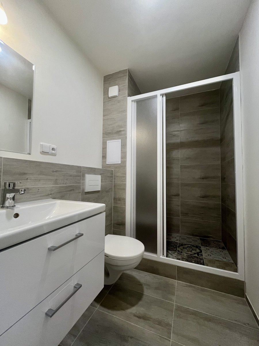 Koupelna se sprchovým koutem, toaletou a pračkou.