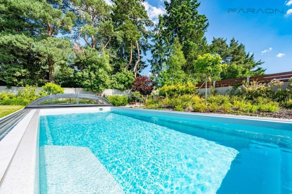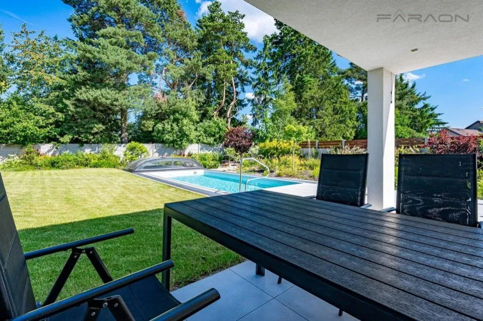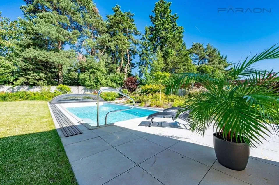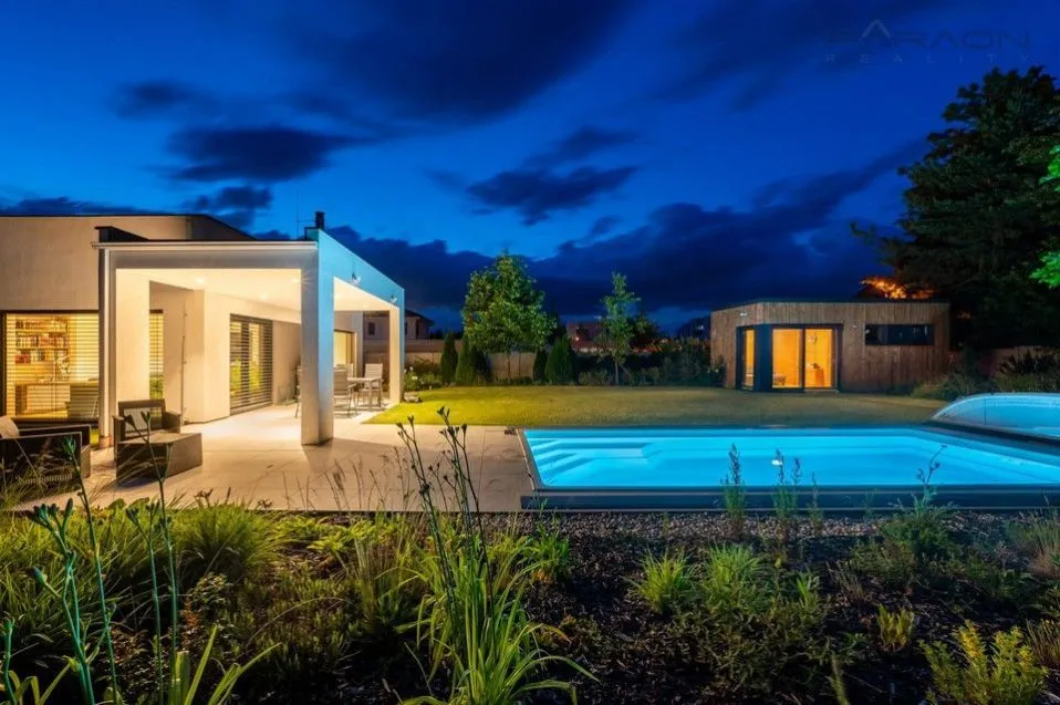 Prodej moderní, pasivní a vzdušné novostavby (A) 3kk obklopené krásnou, udržovanou zahradou s bazénem, vytápěné tepelným čerpadlem, včetně vyhřívání zastřešeného bazénu (7,2 x 3,4 m) se slanou vodou a protiproudem, splňuje veškeré nároky na bydlení vyššího standardu v přírodě s nízkými provozními náklady, a to v luxusním jednopodlažním domě s rekuperací vzduchu. Dům nabízí vzdušný a slunný interiér na krásném, rovinatém a slunném pozemku o velikosti 1 132 m v klidné rezidenční části obce Mukařov Srbín nedaleko Říčan, pouhých 20 km od Prahy. Pozemek zahrnuje upravenou zahradu s automatickým zavlažováním. Pozemek zahrnuje upravenou zahradu s automatickým zavlažováním a designový zahradní domek se sociálním zařízením (koupelna, toaleta), samostatným pokojem a technickou místností (sklad), vše lemováno vzrostlou zelení, zděným plotem a hliníkovými lamelami, které zajišťují maximální nerušené soukromí a zároveň pocit intimity a ničím nerušeného klidu.