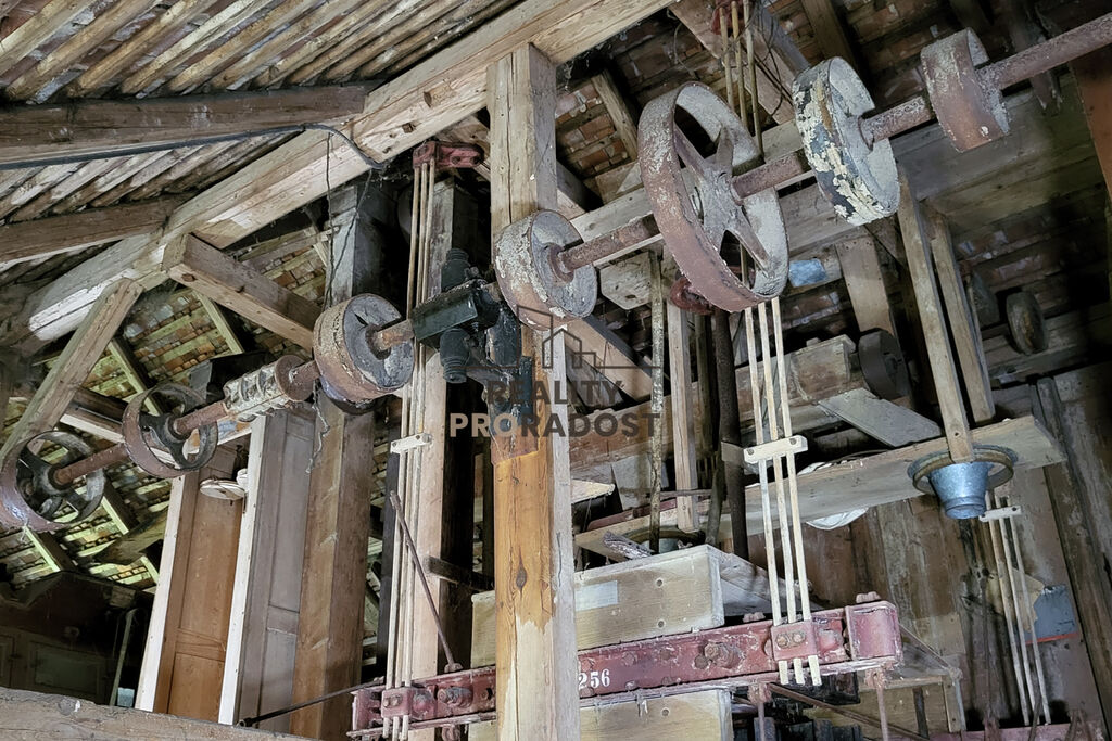Tři patra původní mlýnice s dochovanými dřevěnými konstrukcemi, převody a technikou
