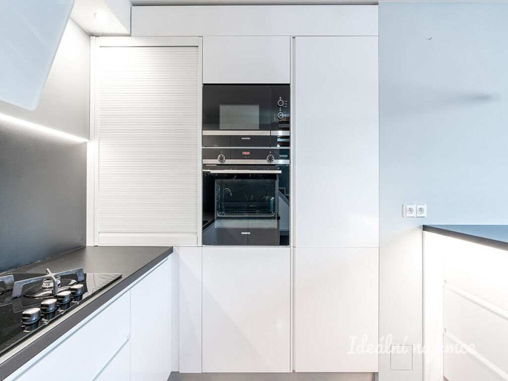 Kuchyně vyrobena na míru je zařízena všemi vestavnými spotřebiči - vestavná trouba, indukční deska, mikrovlnná trouba, odtahová digestoř, myčka a lednice.