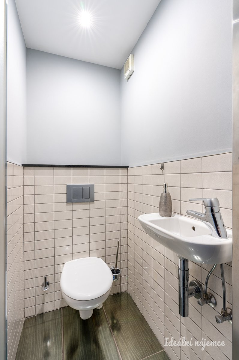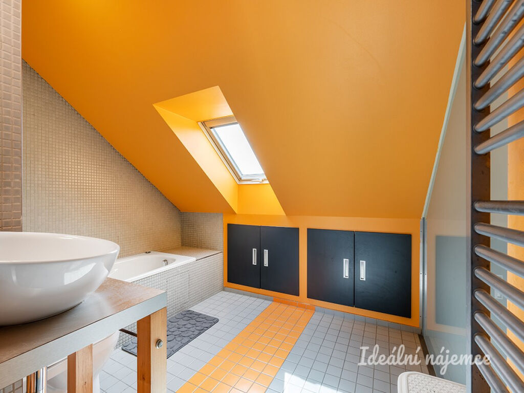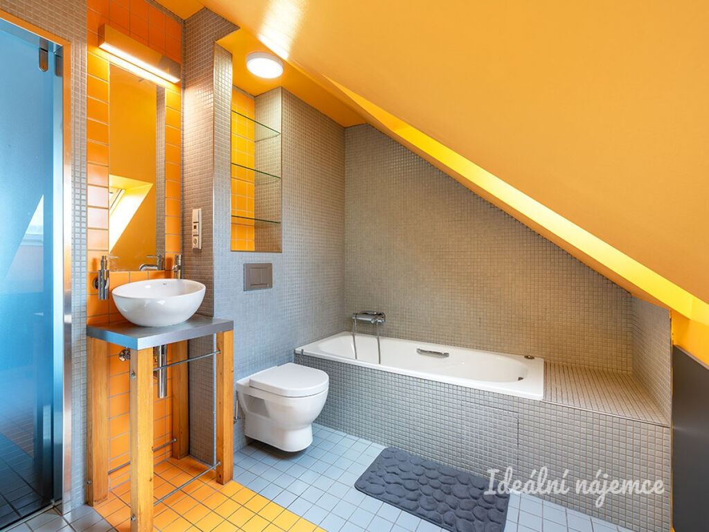Po schodech se vhází do patra bytu, kde je druhá koupelna s vanou a toaletou a ložnice se vstupem na velmi prostornou terasu.