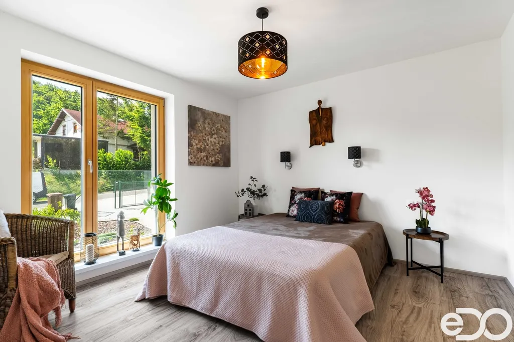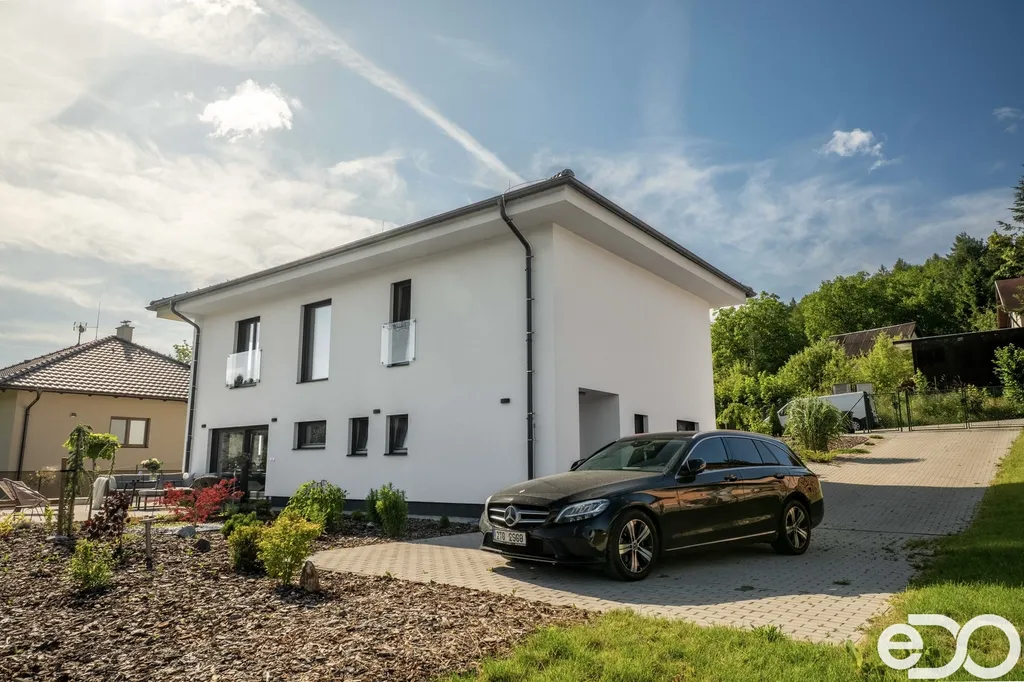 Dům je nízkoenergetický, vytápěný tepelným čerpadlem, s podlahovým topením, rekuperací a elektrickými roletami. Dispozice nabídne prostorný obývací pokoj s výstupem na terasu s krásným výhledem, kuchyňský kout, ložnici, tři další pokoje, koupelnu i technické zázemí. Zahrada má dost místa na bazén, pěstování i rodinné aktivity.