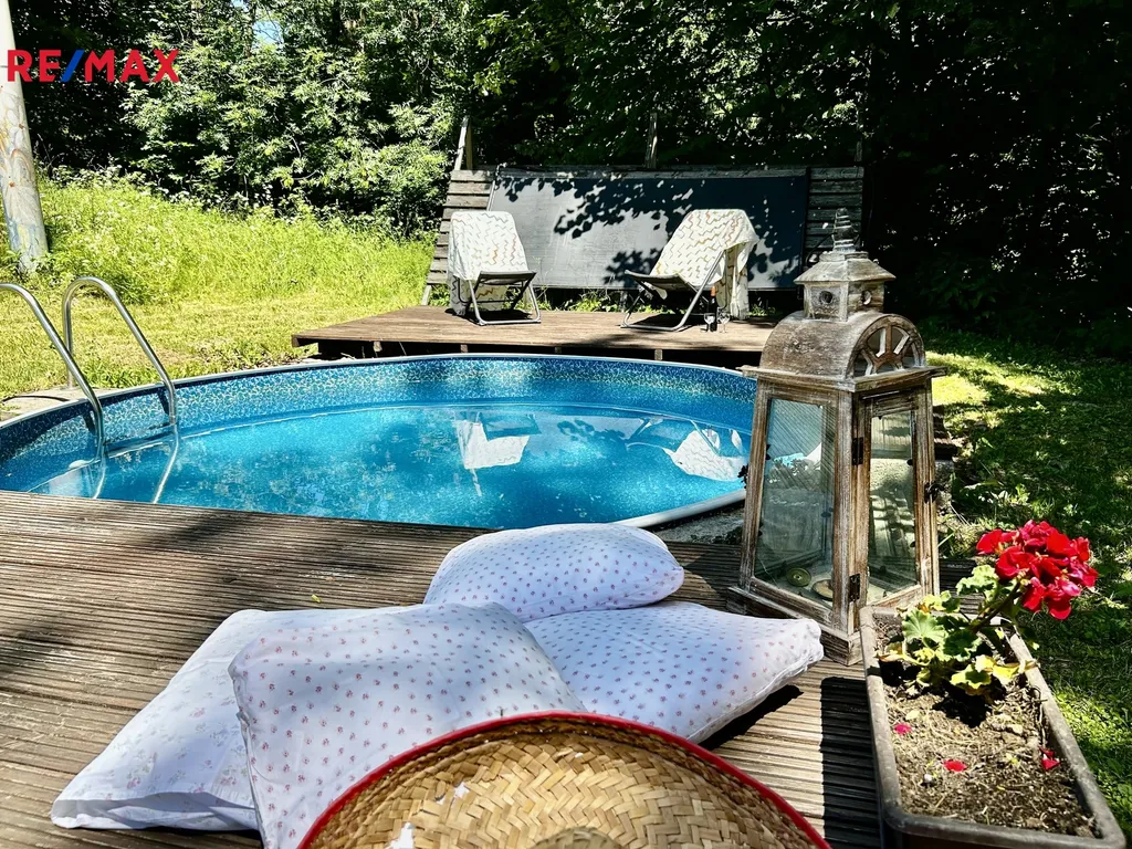 Součástí chalupy je i bazén o ploše 6 m², který příjemně osvěží v horkých letních dnech. Co se týče technického zázemí, odpad je řešen trativodem, přičemž přívod vody zajišťuje vrtaná studna 35 m hluboká, což je další výhodou pro ekologické hospodaření. Chalupa je vytápěna pomocí elektrokotle, radiátorů a krbových kamen, přičemž teplou vodu zajišťuje elektrický bojler.