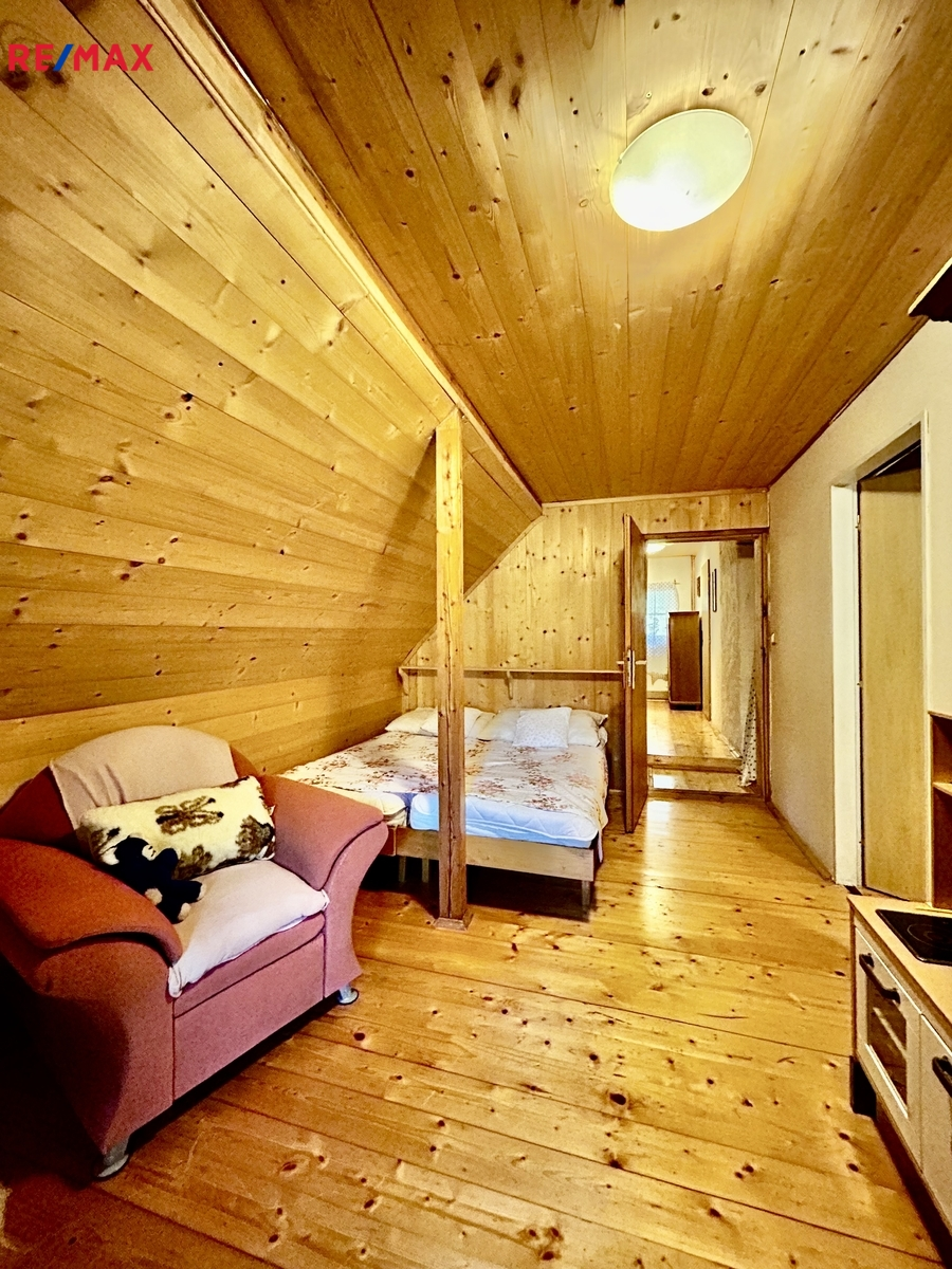 Zrekonstruovaná chalupa stojící v klidné části obce, kde je zajištěno soukromí díky velkému pozemku (louka, les). K dispozici je venkovní terasa s grilem, zahradním nábytkem, dětská houpačka, pískoviště, hřiště na volejbal nebo nohejbal, bazén. Nemovitost se skládá z přízemí a patra. V přízemí se nachází plně vybavena kuchyně, obývací pokoj, koupelna a technická místnost. Dále je k dispozici lyžárna (popř. uložení kol). Dubové schody vedou do salonku prvního patra, kterým je možnost vstoupit do 4 ložnic a vestavěného patra pro dvě osoby. Chalupa poskytuje ubytování pro 6 osob ve 4 ložnicích. Nemovitost lze využít k soukromému bydlení nebo jako investiční příležitost k pronájmu, vzhledem k tomu, že je celoročně obyvatelná a přístupná.