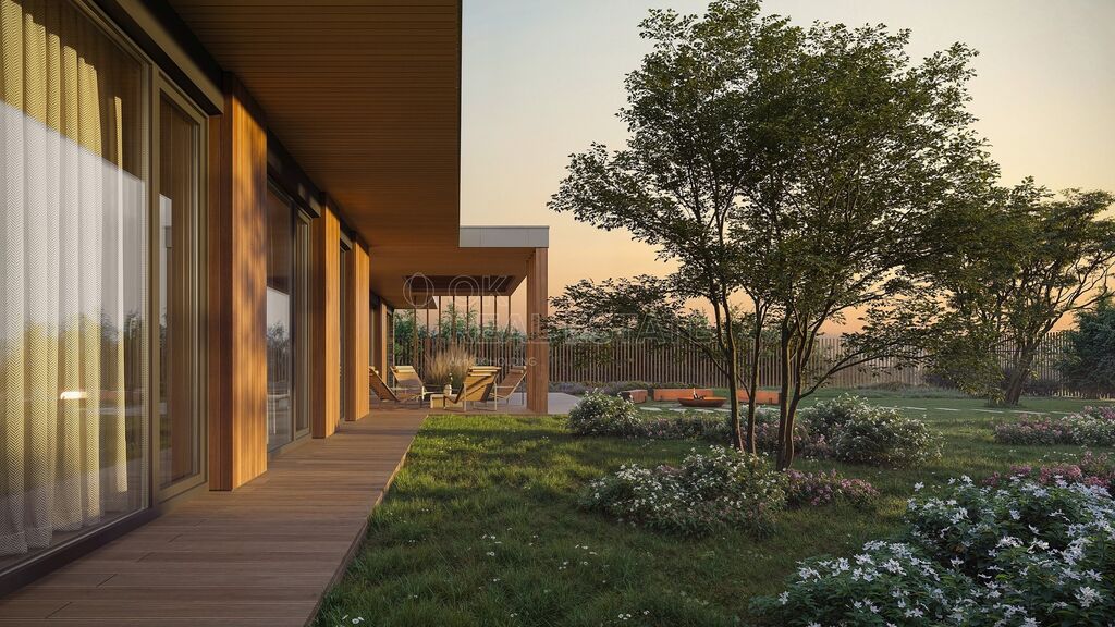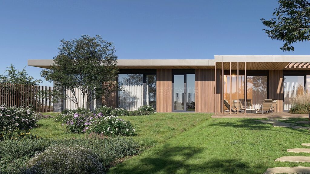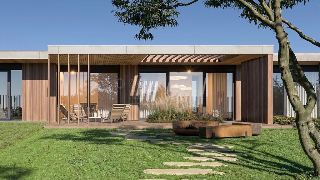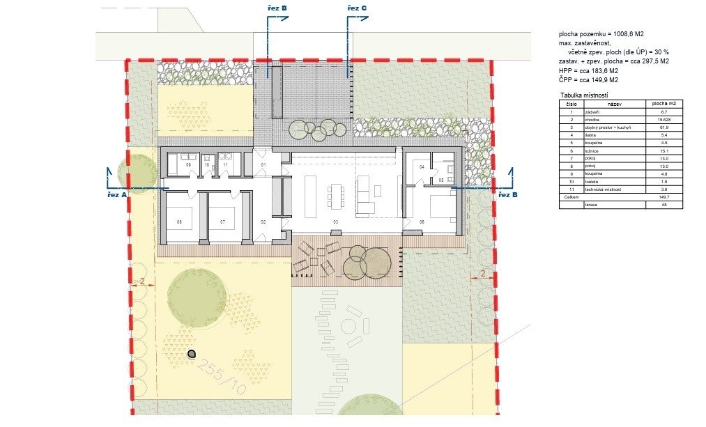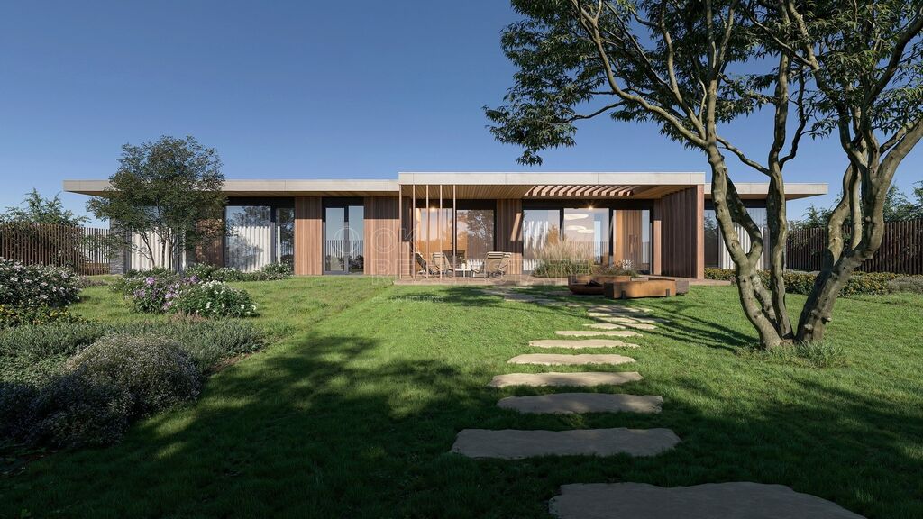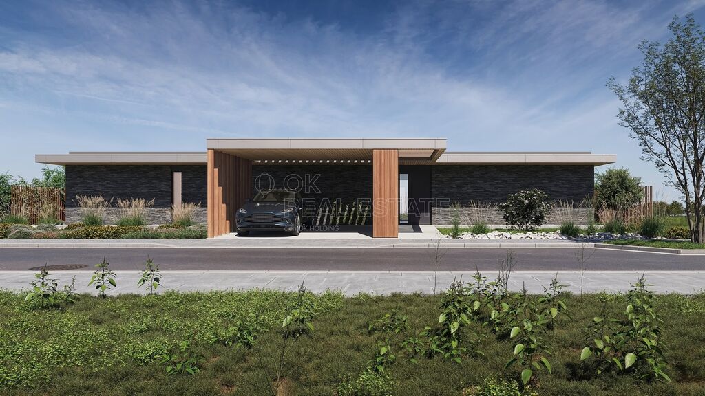 Pokud si budete přát, můžete si od majitele dokoupit i architektonickou studii od od renomovaného studia Expert Architects (EXA) a také zajištění stavebního povolení na vyprojektovaný dům. Moderní bungalov má hrubou podlahovou plochu 184 m2 a čistou 150 m2, dřevěná terasa bude mít 48 m2. Dispozice bude 4+kk, nechybí 2 koupelny, šatna nebo technická místnost. Parkování v severní části pozemku je koncipováno jako přístřešek pro 2 automobily. Vytápění a ohřev vody obstará tepelné čerpadlo vzduch-voda, počítá se s podlahovým vytápěním.