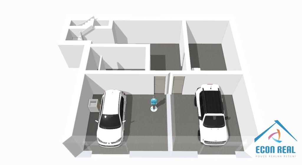 1PP slouží jako technické zázemí: dvě samostatné garáže s novými vraty, technická místnost, prádelna a též kotelna.